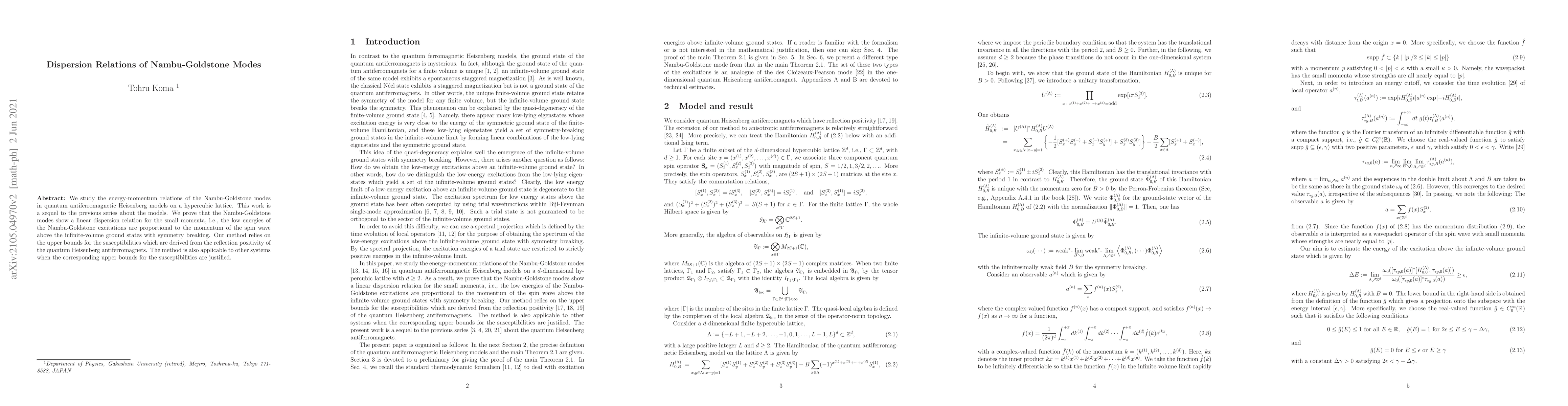 This paper investigates the energy-momentum relations of Nambu-Goldstone modes in quantum antiferromagnetic Heisenberg models, proving a linear dispersion relation for small momenta. The study employs upper bounds for susceptibilities derived from reflection positivity, applicable to other systems with justified bounds.