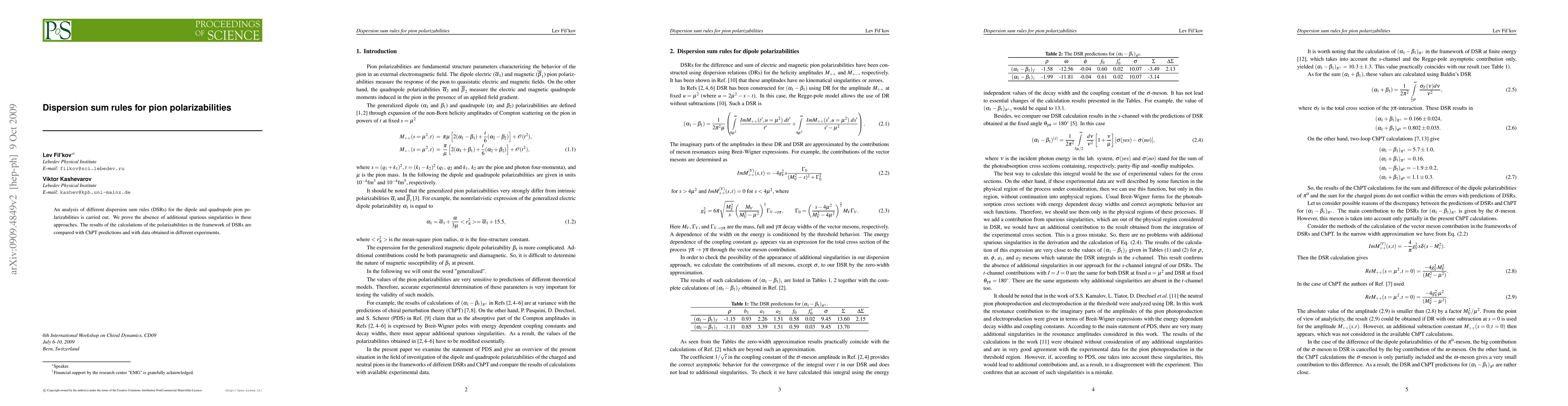 This paper analyzes dispersion sum rules for pion polarizabilities, confirming the absence of spurious singularities. It compares calculated polarizabilities from these rules with predictions from Chiral Perturbation Theory and experimental data.