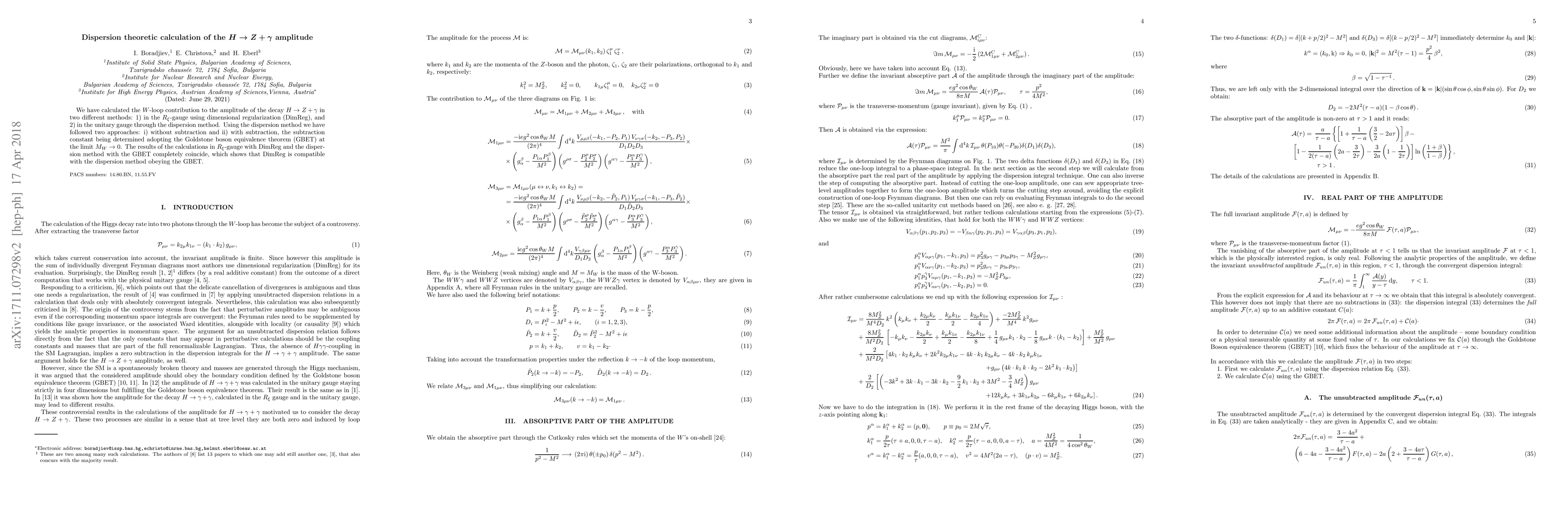 This paper calculates the $W$-loop contribution to the $H\rightarrow Z+\gamma$ decay amplitude using both dimensional regularization and the dispersion method, showing that the results coincide, confirming the compatibility of dimensional regularization with the dispersion method under the Goldstone boson equivalence theorem.