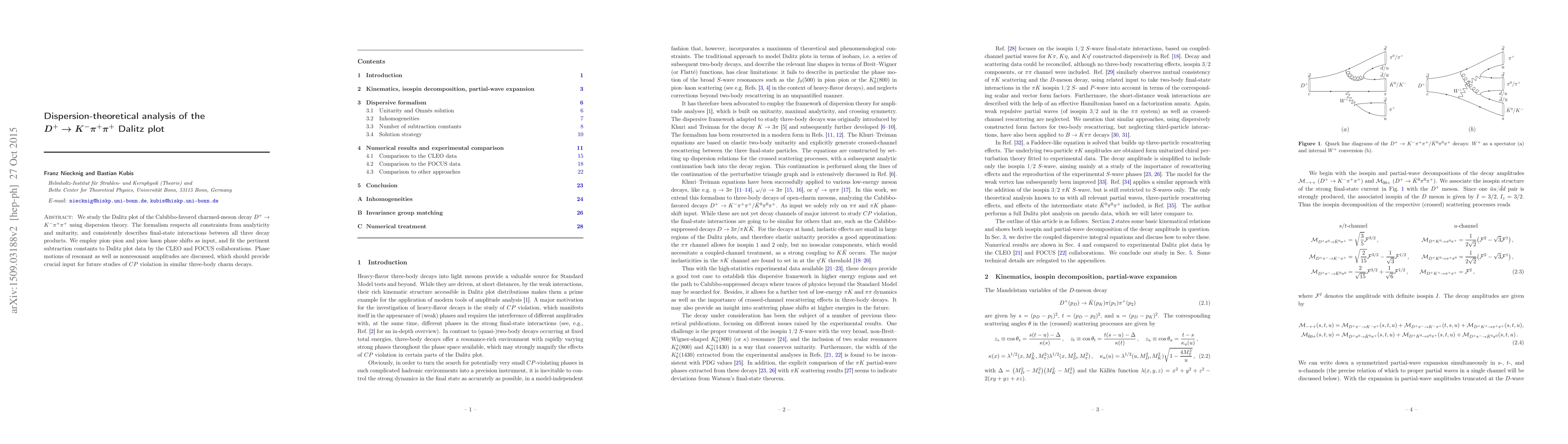 This paper uses dispersion theory to analyze the Dalitz plot for the decay $D^+\to K^-\pi^+\pi^+$, incorporating final-state interactions and fitting phase shifts to experimental data. The study aims to provide insights into CP violation in similar three-body charm decays.