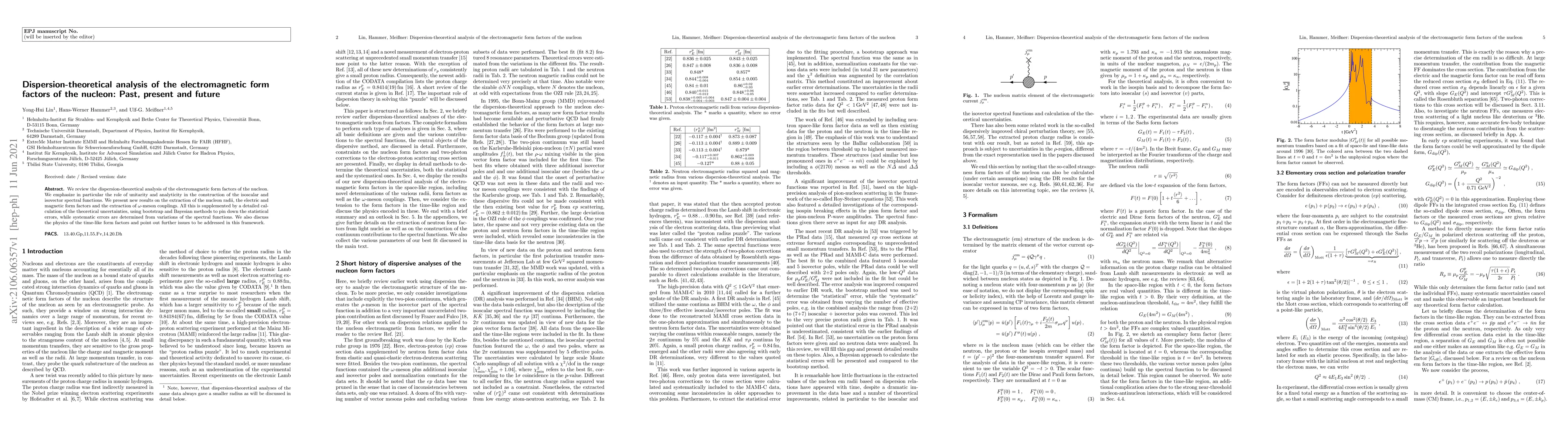 This paper reviews the dispersion-theoretical analysis of nucleon electromagnetic form factors, emphasizing unitarity and analyticity in spectral function construction. It presents new results on nucleon radii and form factors, supplemented by detailed uncertainty calculations, and discusses future research directions.