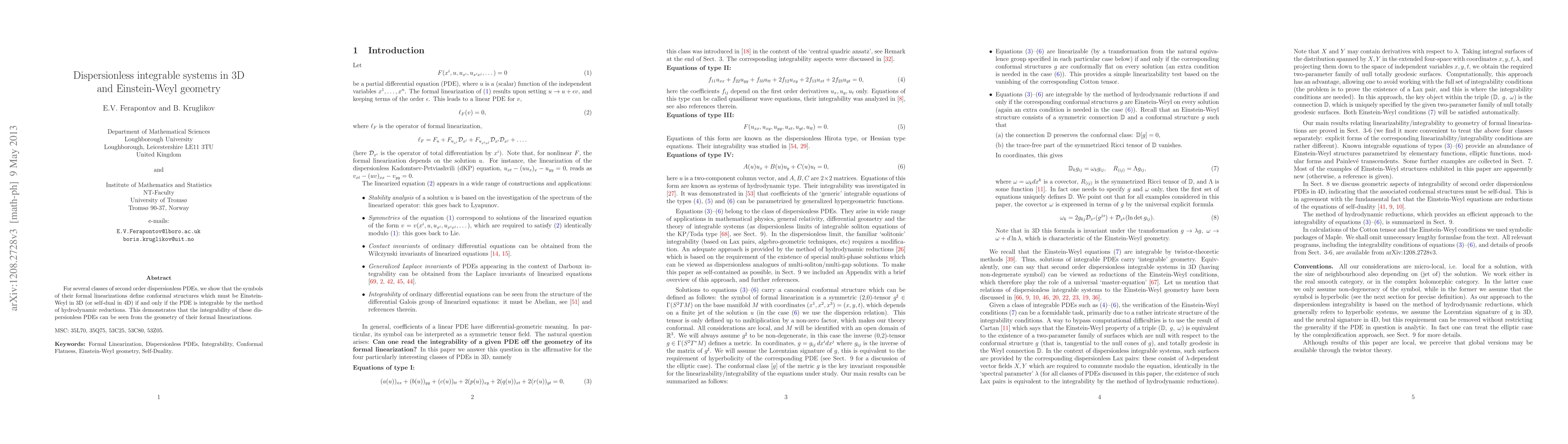 The paper employs geometric techniques to analyze dispersionless integrable systems in 3D, demonstrating that the symbols of their formal linearizations define conformal structures which must be Einstein-Weyl in 3D for integrability by hydrodynamic reductions.