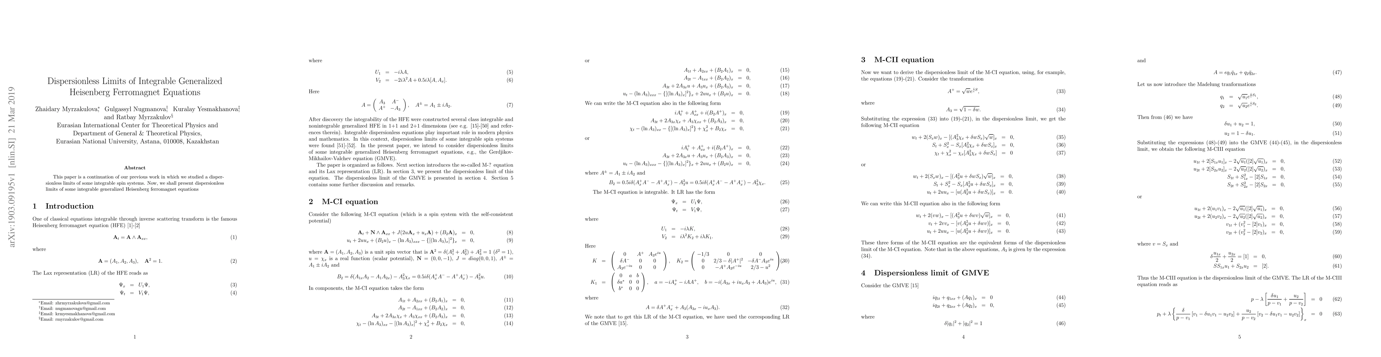 This paper explores the dispersionless limits of integrable generalized Heisenberg ferromagnet equations, extending previous research on similar integrable spin systems. The focus is on understanding the behavior of these systems without dispersion effects.
