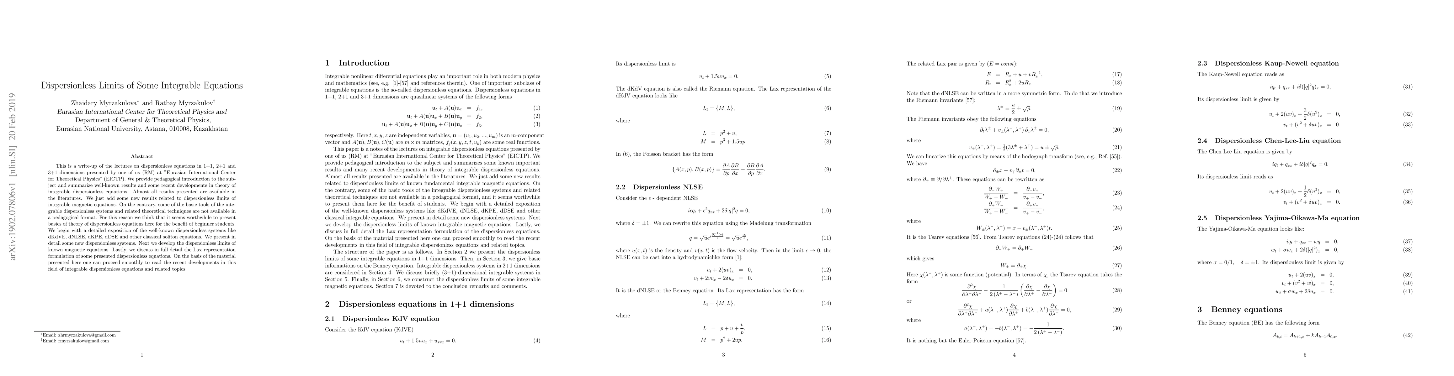 This paper provides a pedagogical introduction to dispersionless integrable equations in various dimensions, summarizing well-known results and recent developments, particularly focusing on the dispersionless limits of integrable magnetic equations. It also details the Lax representation for several classical and new dispersionless systems.