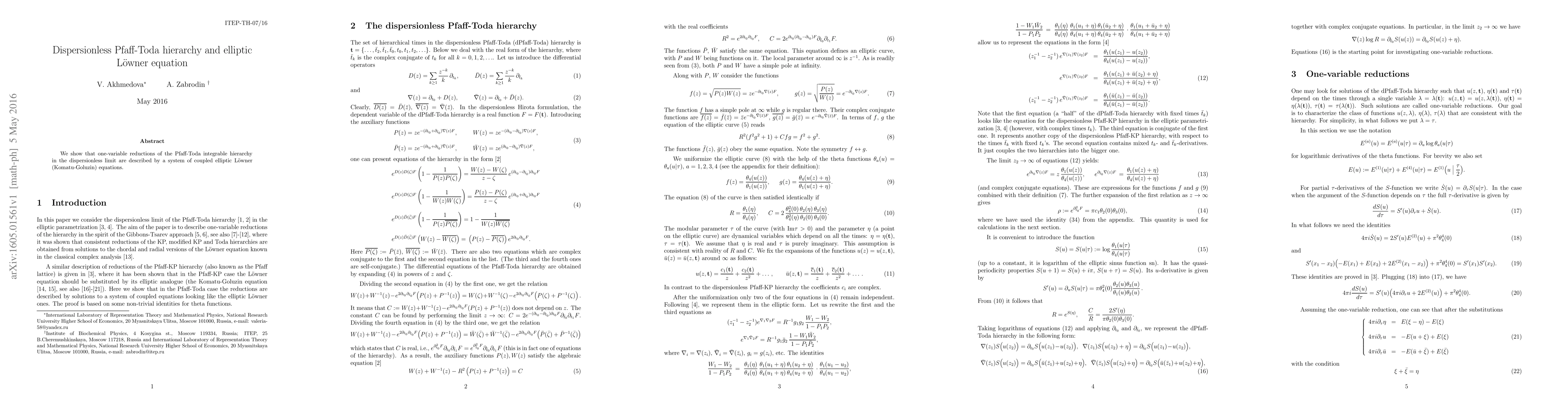 We show that one-variable reductions of the Pfaff-Toda integrable hierarchy in the dispersionless limit are described by a system of coupled elliptic L\"owner (Komatu-Goluzin) equations.