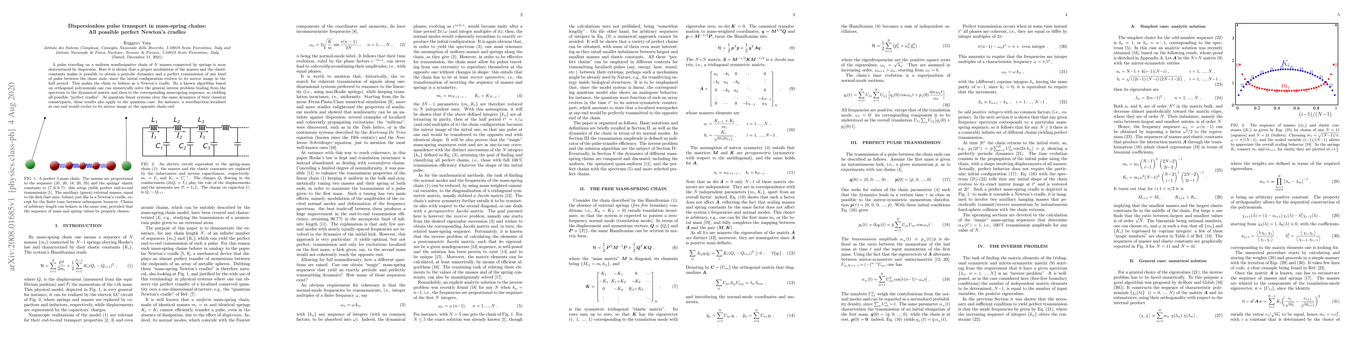 A pulse traveling on a uniform nondissipative chain of $N$ masses connected by springs is soon destructured by dispersion. Here it is shown that a proper modulation of the masses and the elastic constants makes it possible to obtain a periodic dynamics and a perfect transmission of any kind of pulse between the chain ends, since the initial configuration evolves to its mirror image in the half period. This makes the chain to behave as a Newton's cradle. By a known algorithm based on orthogonal polynomials one can numerically solve the general inverse problem leading from the spectrum to the dynamical matrix and then to the corresponding mass-spring sequence, so yielding all possible ``perfect cradles''. As quantum linear systems obey the same dynamics of their classical counterparts, these results also apply to the quantum case: for instance, a wavefunction localized at one end would evolve to its mirror image at the opposite chain end.