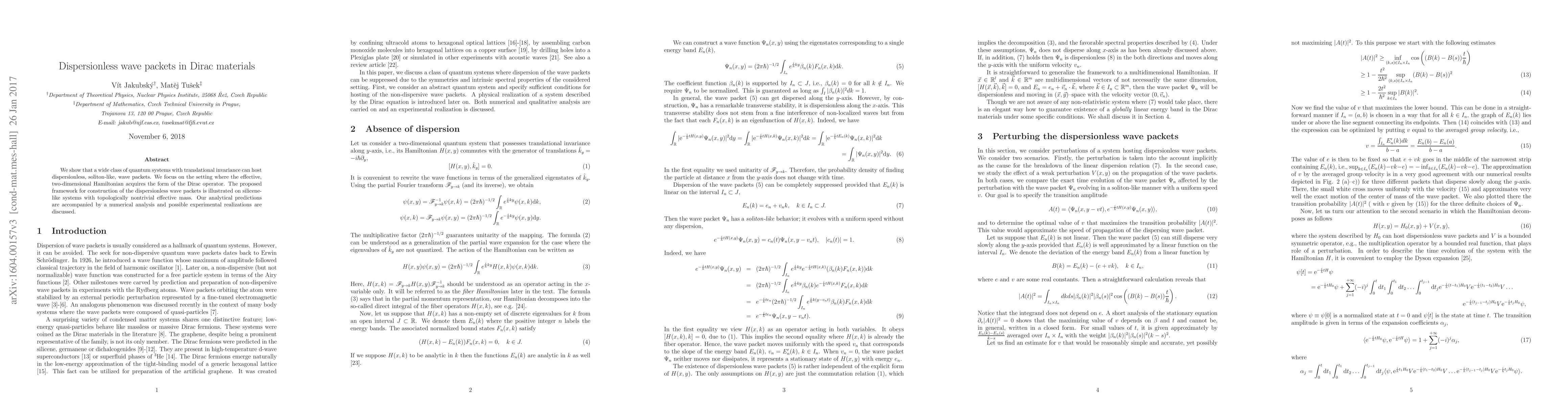 This research demonstrates that quantum systems with translational invariance, particularly Dirac materials, can support soliton-like, dispersionless wave packets. The study provides an analytical framework and numerical analysis for constructing these wave packets, illustrated using silicene-like systems, and discusses potential experimental implementations.