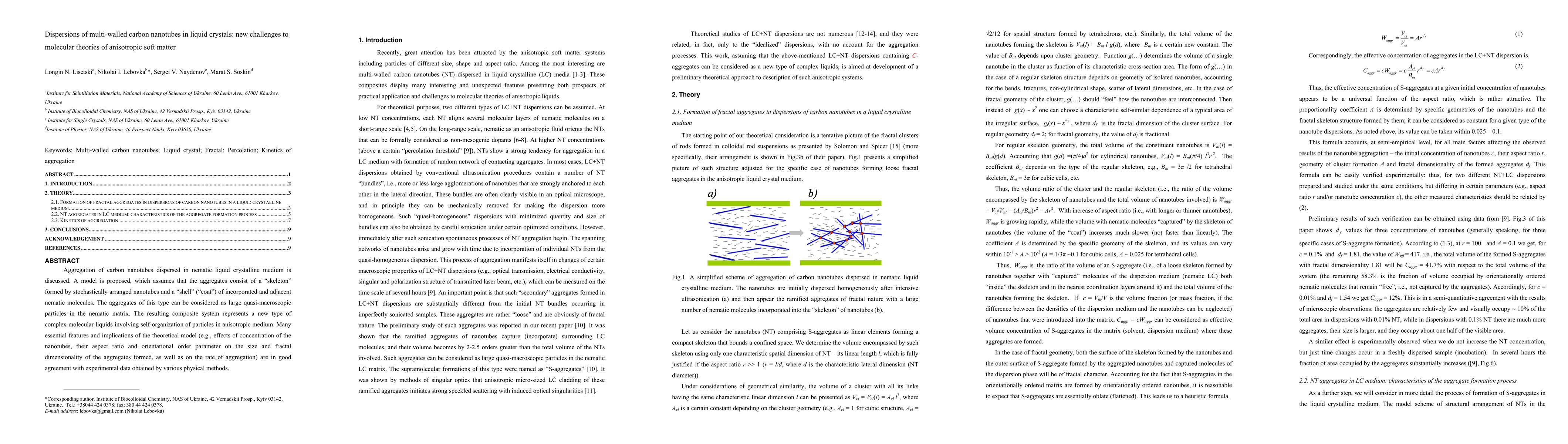 Researchers propose a new model to explain the aggregation of carbon nanotubes in liquid crystals, suggesting that aggregates form from a 'skeleton' of nanotubes surrounded by nematic molecules, with key features in good agreement with experimental data.