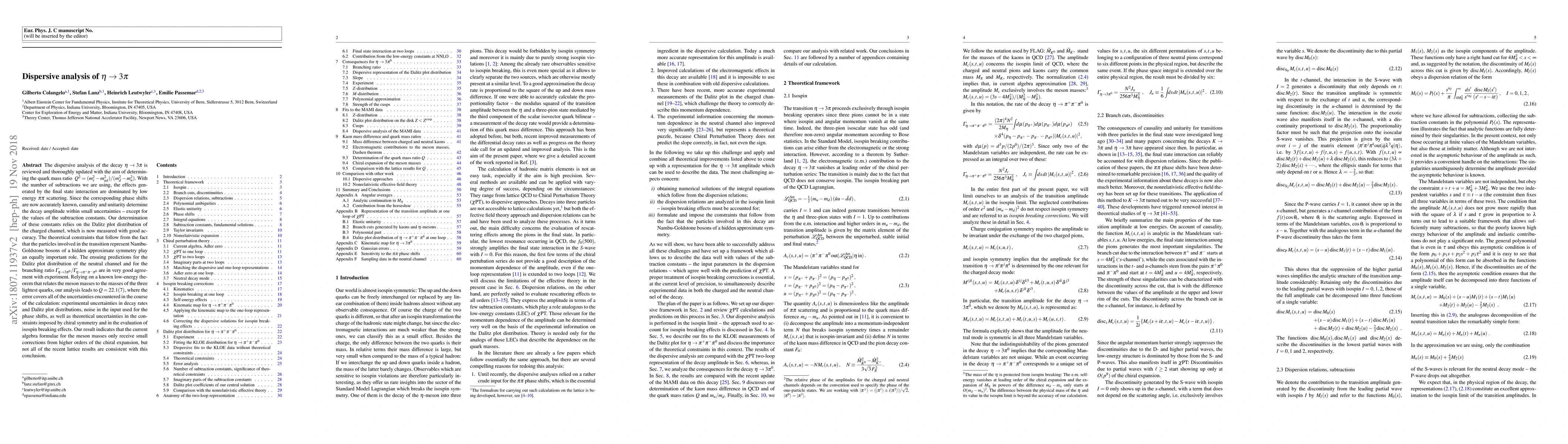 The dispersive analysis of the decay $\eta\to3\pi$ is reviewed and thoroughly updated with the aim of determining the quark mass ratio ~$Q^2=(m_s^2-m_{ud}^2)/(m_d^2-m_u^2)$. With the number of subtractions we are using, the effects generated by the final state interaction are dominated by low energy $\pi\pi$ scattering. Since the corresponding phase shifts are now accurately known, causality and unitarity determine the decay amplitude within small uncertainties -- except for the values of the subtraction constants. Our determination of these constants relies on the Dalitz plot distribution of the charged channel, which is now measured with good accuracy. The theoretical constraints that follow from the fact that the particles involved in the transition represent Nambu-Goldstone bosons of a hidden approximate symmetry play an equally important role. The ensuing predictions for the Dalitz plot distribution of the neutral channel and for the branching ratio $\Gamma_{\eta\to3\pi^0}/ \Gamma_{\eta\to\pi^+\pi^-\pi^0}$ are in very good agreement with experiment. Relying on a known low-energy theorem that relates the meson masses to the masses of the three lightest quarks, our analysis leads to $Q=22.1(7)$, where the error covers all of the uncertainties encountered in the course of the calculation: experimental uncertainties in decay rates and Dalitz plot distributions, noise in the input used for the phase shifts, as well as theoretical uncertainties in the constraints imposed by chiral symmetry and in the evaluation of isospin breaking effects. Our result indicates that the current algebra formulae for the meson masses only receive small corrections from higher orders of the chiral expansion, but not all of the recent lattice results are consistent with this conclusion.