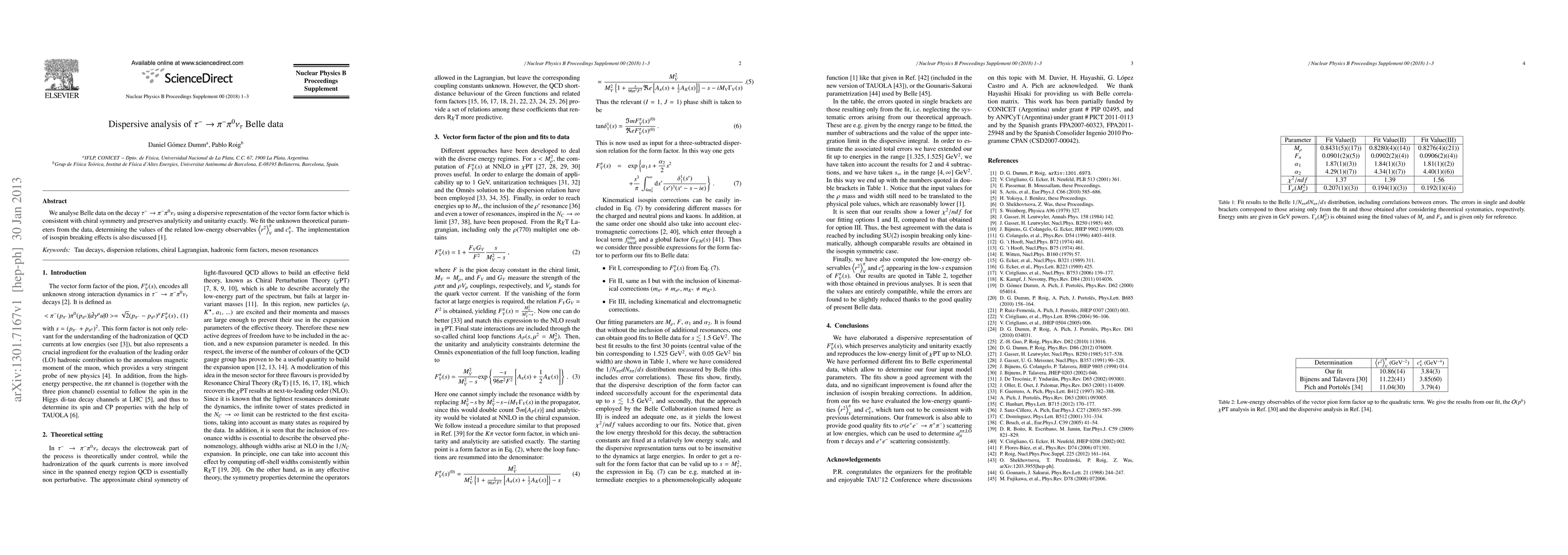 This paper analyzes Belle data on the decay $\tau^- \to \pi^- \pi^0 \nu_\tau$ using a dispersive representation, fitting theoretical parameters to determine low-energy observables $\left\langle r^2\right\rangle^\pi_V$ and $c_V^\pi$, while discussing the implementation of isospin breaking effects.