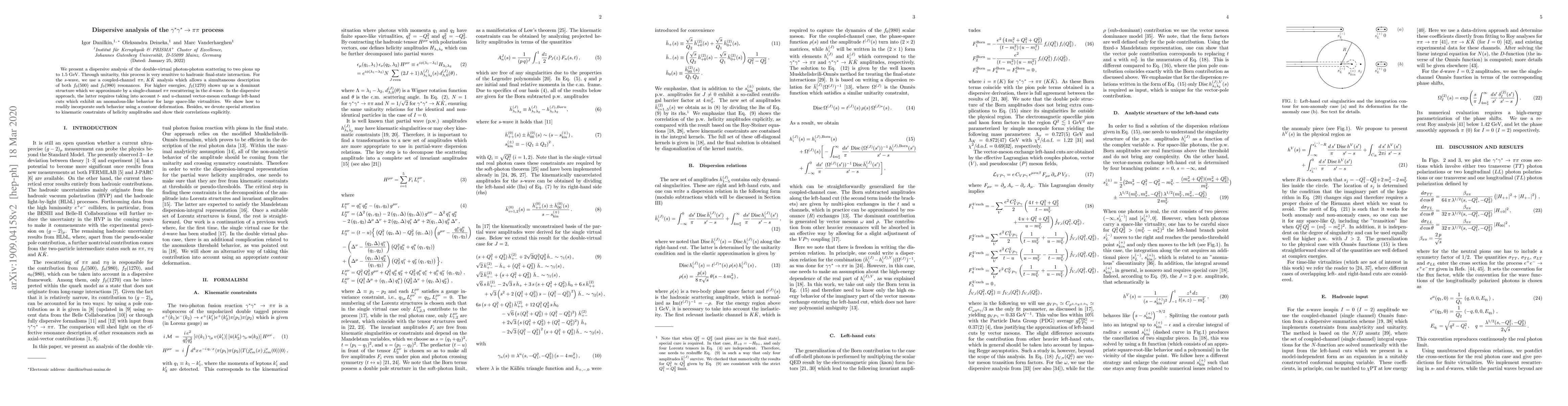 This paper conducts a dispersive analysis of double-virtual photon-photon scattering producing two pions up to 1.5 GeV, focusing on hadronic final state interactions. It employs a coupled-channel approach for $s$-wave and a single channel approximation for higher energies, incorporating anomalous vector-meson exchange and demonstrating the use of contour deformation to account for this behavior.