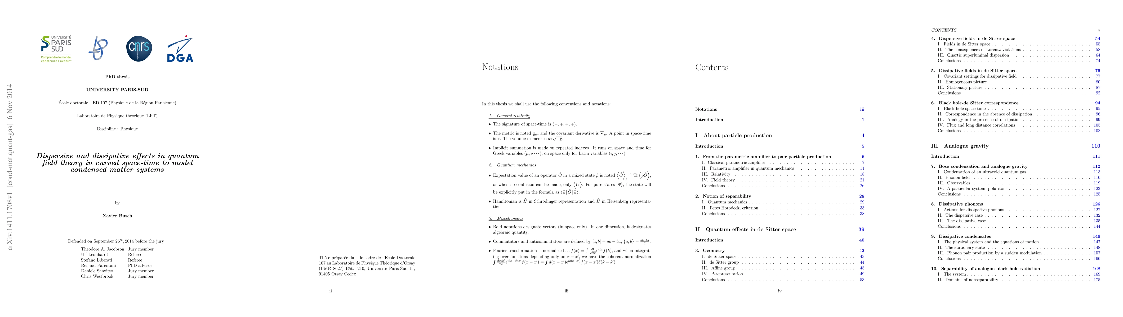 This paper investigates the dispersive and dissipative effects in quantum field theory in curved space-time, proposing analogue models in condensed matter systems to test predictions like Hawking radiation and cosmological pair production. It computes the impact of these effects on entanglement and spontaneous emission in the context of de Sitter space and black holes, and applies these findings to Bose Einstein condensates and exciton-polariton systems.
