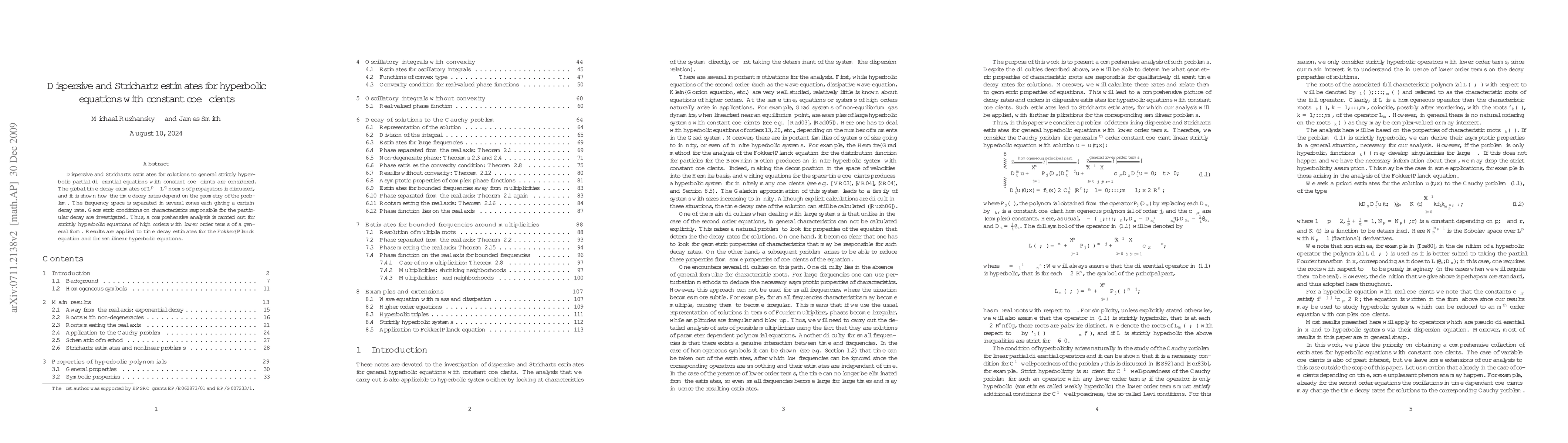 This paper derives dispersive and Strichartz estimates for strictly hyperbolic partial differential equations with constant coefficients, analyzing the time decay rates of $L^p-L^q$ norms of propagators. It identifies geometric conditions on the characteristics influencing the decay and applies the results to establish time decay estimates for the Fokker-Planck equation and semilinear hyperbolic equations.