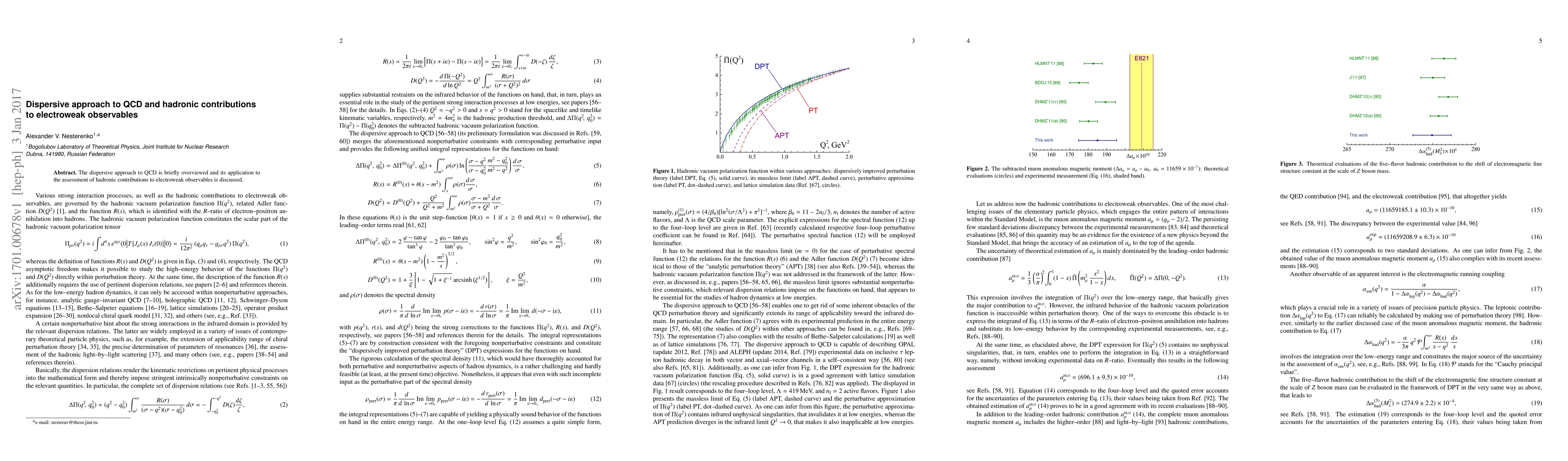 Summary: This paper reviews the dispersive approach to Quantum Chromodynamics (QCD) and explores its utility in evaluating hadronic contributions to electroweak observables, providing insights into the underlying physics.