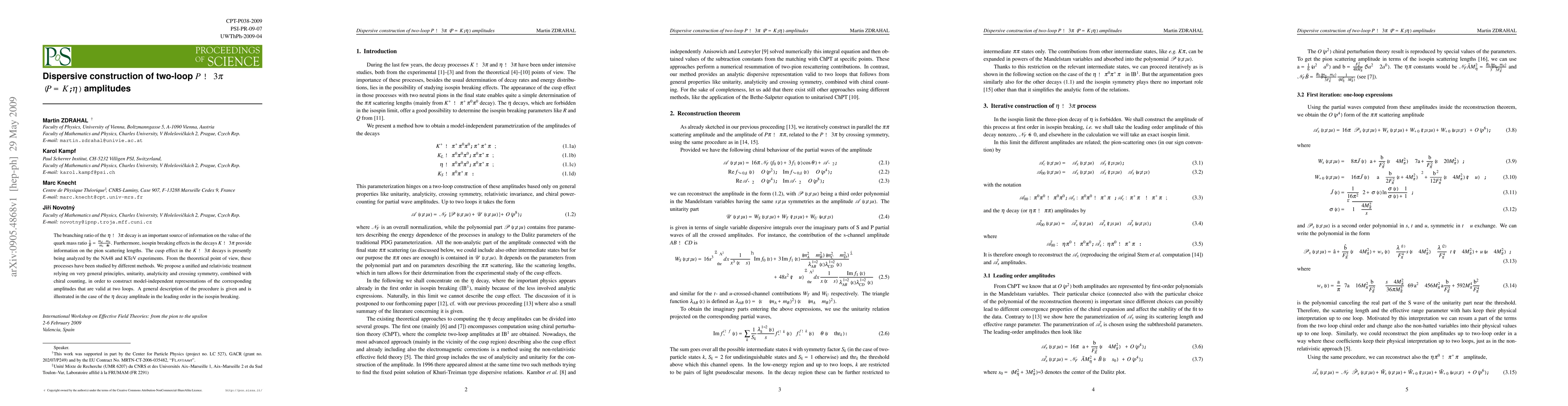 The branching ratio of the \eta->3\pi decay is an important source of information on the value of the quark mass ratio 1/R=(m_d-m_u)/(m_s-\hat m). Furthermore, isospin breaking effects in the decays K->3\pi provide information on the pion scattering lengths. The cusp effect in the K->3\pi decays is presently being analyzed by the NA48 and KTeV experiments. From the theoretical point of view, these processes have been studied by different methods. We propose a unified and relativistic treatment relying on very general principles, unitarity, analyticity and crossing symmetry, combined with chiral counting, in order to construct model-independent representations of the corresponding amplitudes that are valid at two loops. A general description of the procedure is given and is illustrated in the case of the \eta decay amplitude in the leading order in the isospin breaking.