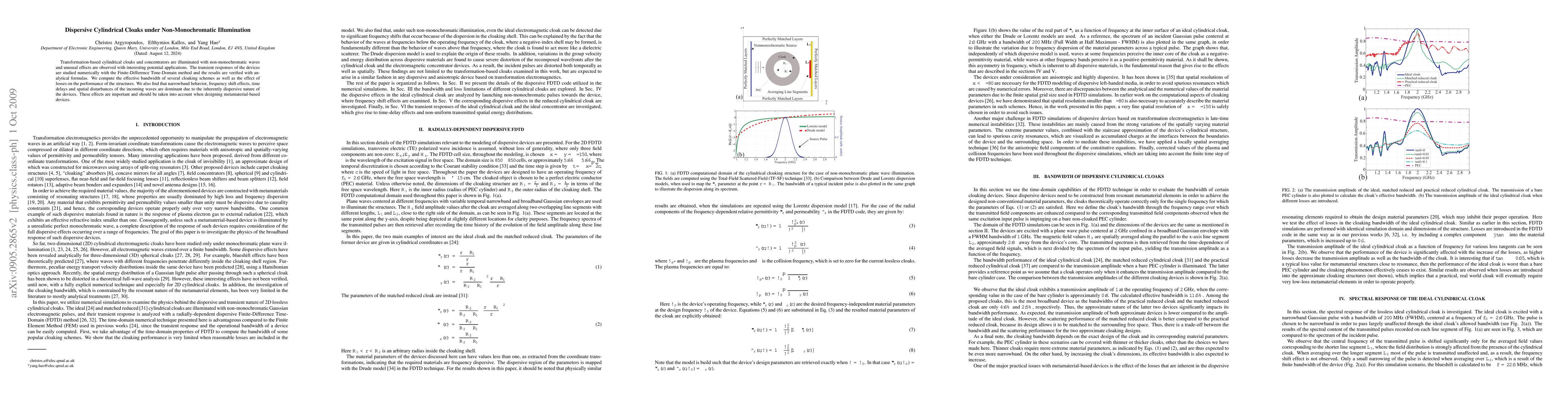 This paper investigates the transient responses of transformation-based cylindrical cloaks under non-monochromatic illumination, revealing dispersive effects like frequency shifts and time delays. Numerical simulations and analytical verification highlight the importance of considering these effects in metamaterial device design.