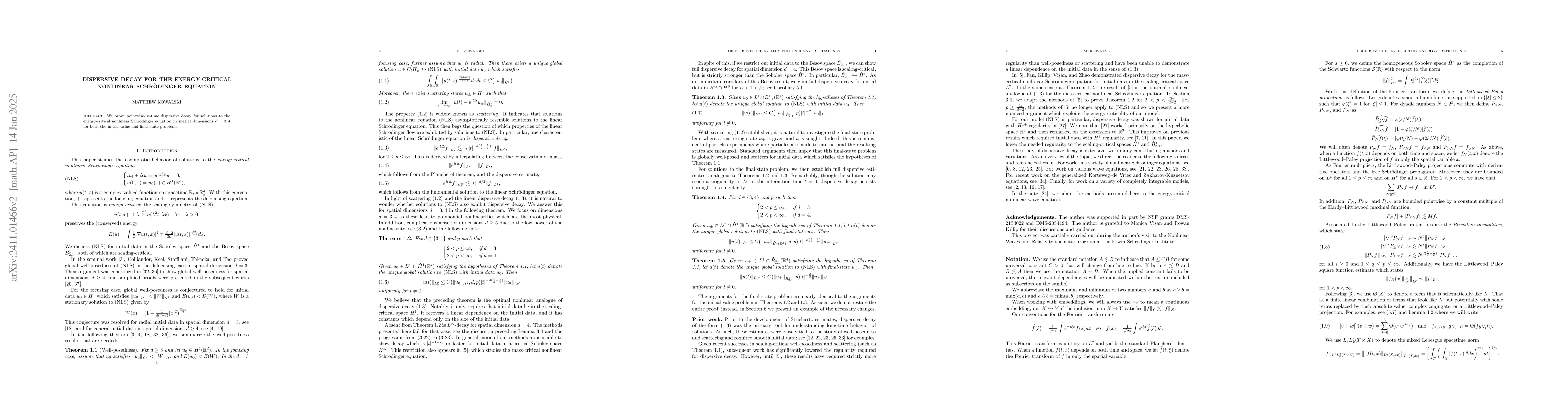 Summary: The paper establishes pointwise-in-time dispersive decay for solutions of the energy-critical nonlinear Schrödinger equation in spatial dimensions 3 and 4, addressing both initial and final-state problems. This result supports the understanding of how solutions spread out over time.