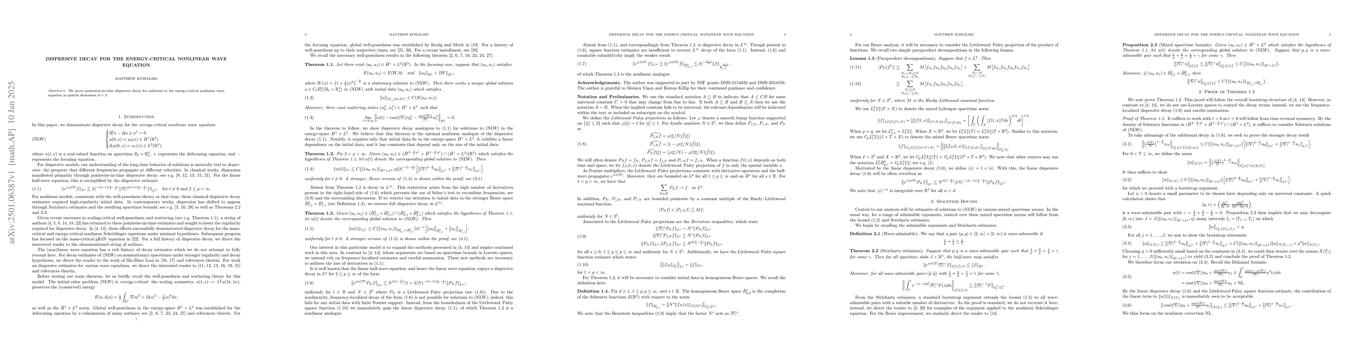 Summary: The paper establishes pointwise-in-time dispersive decay for solutions of the energy-critical nonlinear wave equation in three-dimensional space. This provides insight into the behavior of such solutions over time.