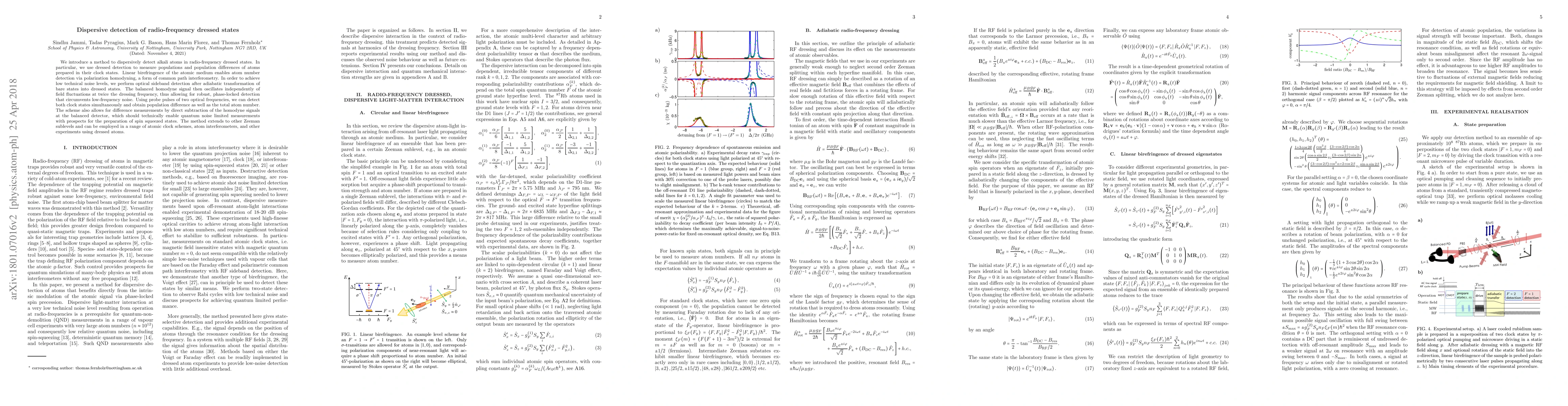 This paper presents a method for dispersively detecting alkali atoms in radio-frequency dressed states, enabling robust measurement of populations and population differences in clock states. The technique uses optical sideband detection and polarization homodyning to achieve low technical noise levels and circumvent low-frequency noise, with potential applications in atomic clocks and quantum experiments.