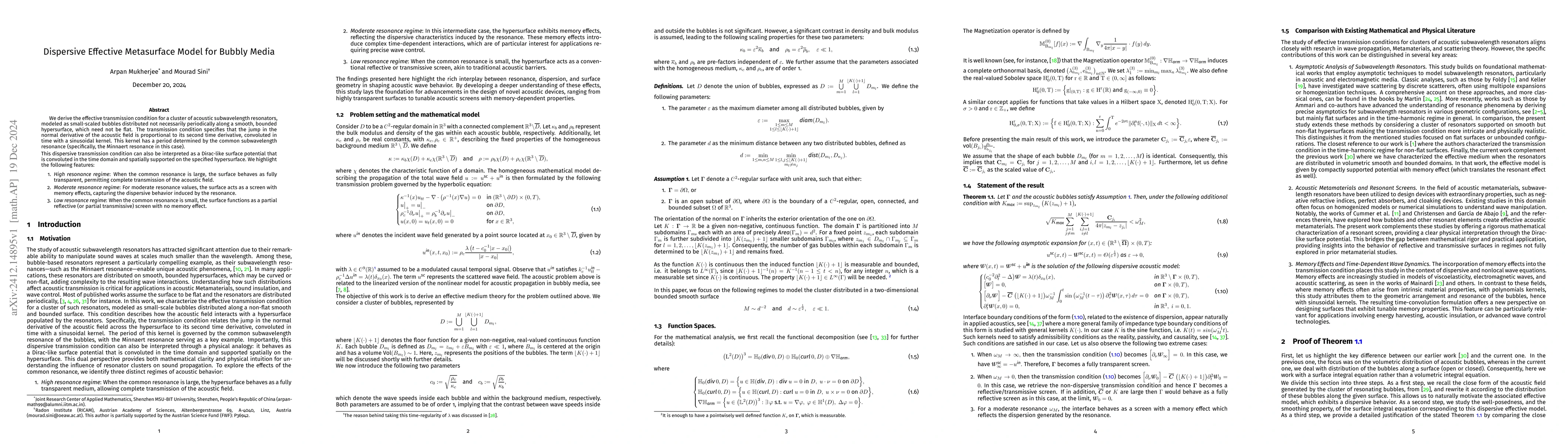 The paper derives an effective transmission condition for acoustic subwavelength resonators modeled as bubbles, revealing three regimes of behavior: full transparency, dispersive screen with memory, and partial reflection/transmission without memory, based on the resonance level.