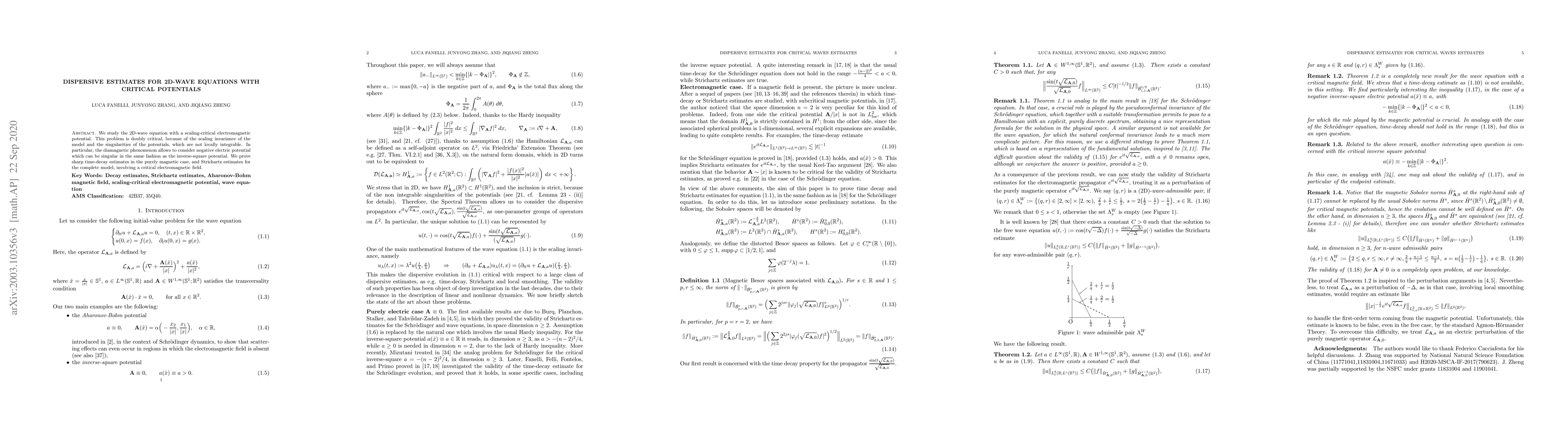 This paper investigates the 2D-wave equation with a scaling-critical electromagnetic potential, proving sharp time-decay estimates for the purely magnetic case and Strichartz estimates for the complete model involving critical electromagnetic fields. The study addresses the doubly critical nature due to the model's scaling invariance and the non-locally integrable singularities of the potentials.