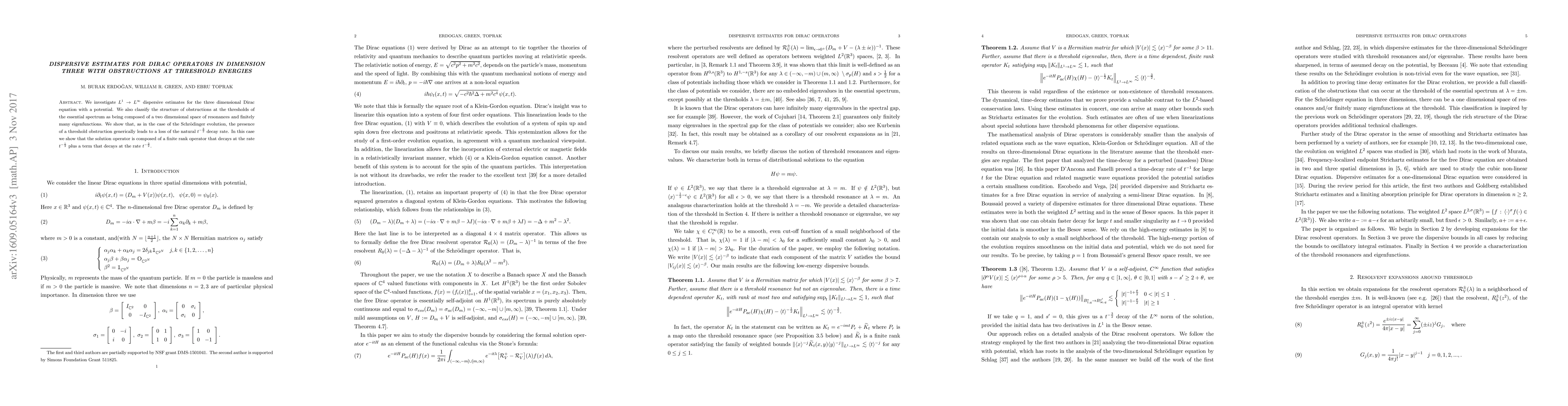 This paper studies $L^1\to L^\infty$ dispersive estimates for the three-dimensional Dirac equation with potentials, revealing that threshold obstructions consist of a two-dimensional space of resonances and finitely many eigenfunctions. It also demonstrates that threshold obstructions lead to a loss of the typical $t^{-\frac{3}{2}}$ decay rate, instead resulting in a $t^{-\frac{1}{2}}$ decay rate for a finite rank operator component.