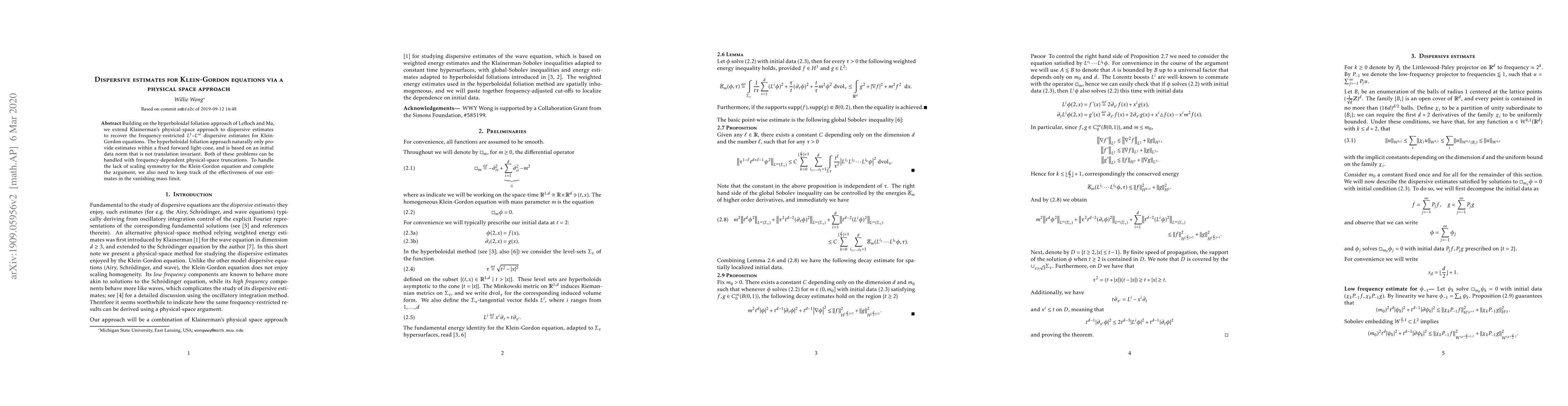 This paper extends Kleinerman's physical-space dispersive estimates to Klein-Gordon equations using a hyperboloidal foliation approach, addressing limitations of previous methods by employing frequency-dependent truncations and considering the vanishing mass limit.