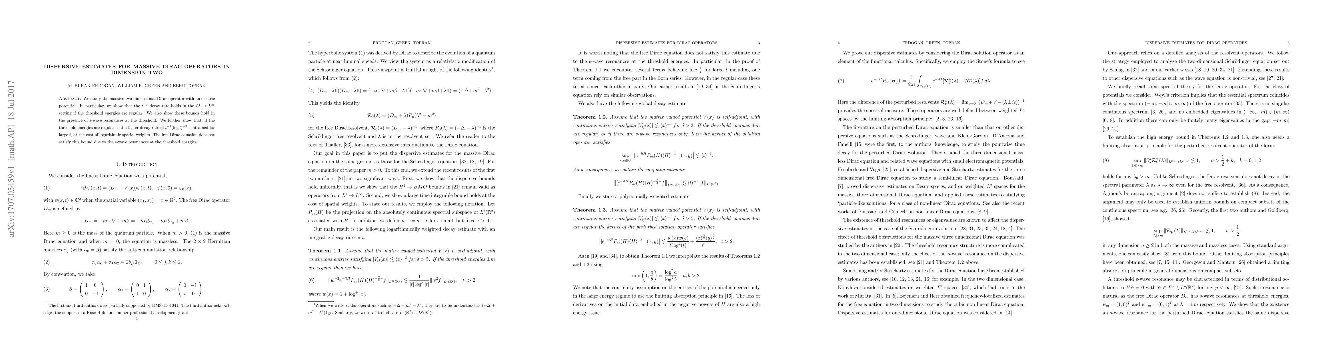The paper studies the massive two-dimensional Dirac operator and finds that a $t^{-1}$ decay rate holds in certain conditions, with faster rates attainable at large $t$ but with logarithmic spatial weights.