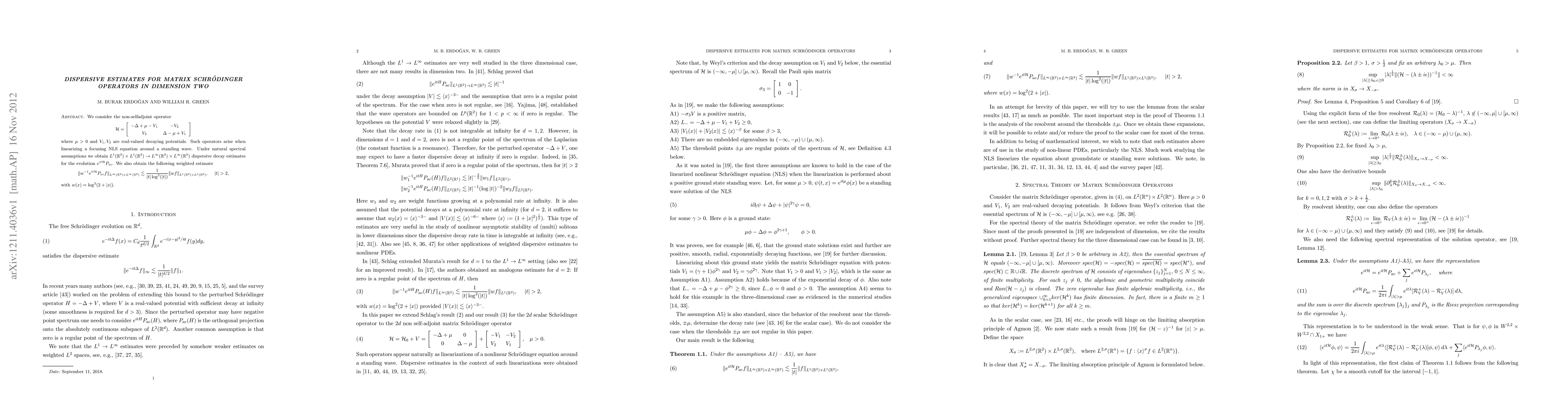 This paper establishes dispersive decay estimates for a non-selfadjoint matrix Schrödinger operator in dimension two, showing it decays to $L^ty( ext{R}^2) imes L^ty( ext{R}^2)$ and provides a weighted estimate with a logarithmic bound.