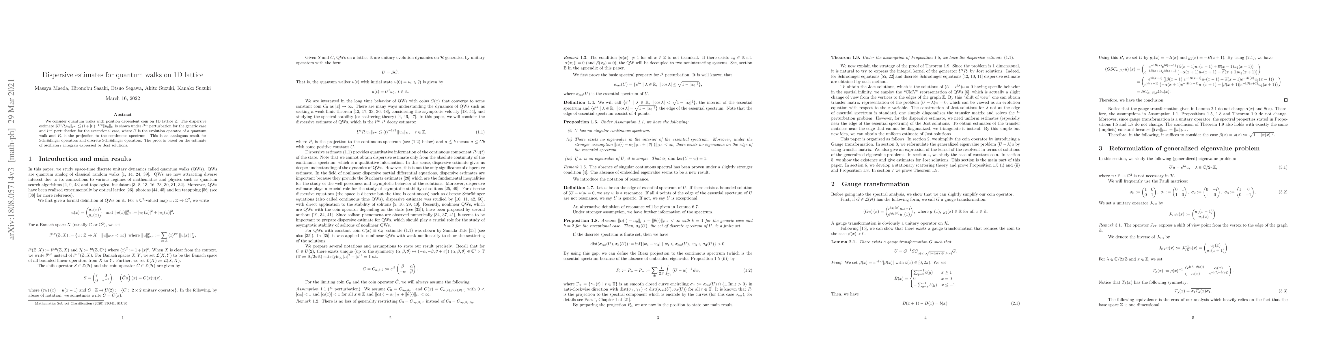 We consider quantum walks with position dependent coin on 1D lattice $\mathbb{Z}$. The dispersive estimate $\|U^tP_c u_0\|_{l^\infty}\lesssim (1+|t|)^{-1/3} \|u_0\|_{l^1}$ is shown under $l^{1,1}$ perturbation for the generic case and $l^{1,2}$ perturbation for the exceptional case, where $U$ is the evolution operator of a quantum walk and $P_c$ is the projection to the continuous spectrum. This is an analogous result for Schr\"odinger operators and discrete Schr\"odinger operators. The proof is based on the estimate of oscillatory integrals expressed by Jost solutions.