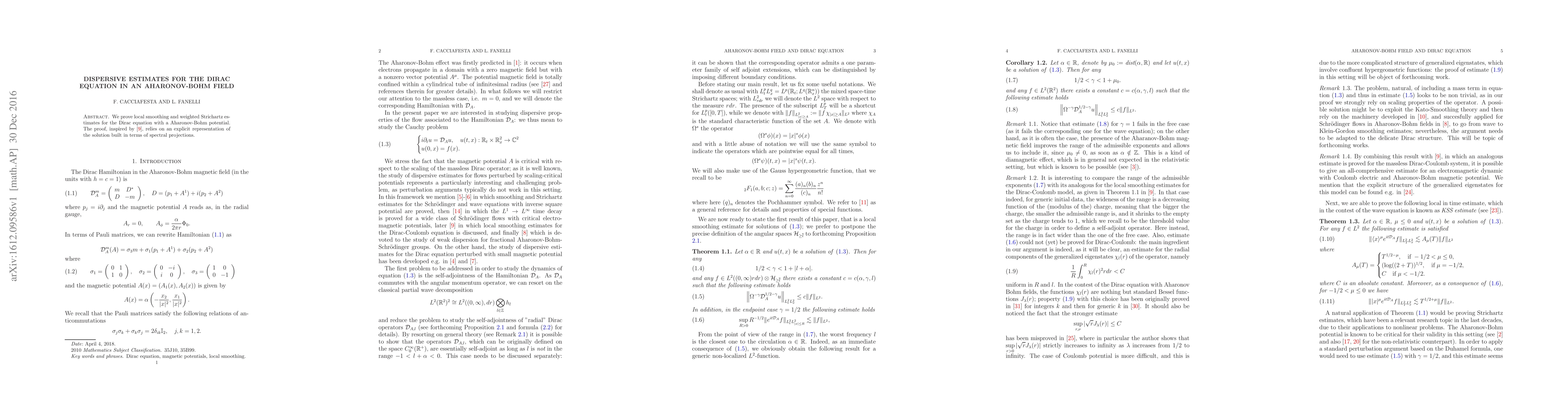 Summary: This paper establishes local smoothing and weighted Strichartz estimates for the Dirac equation influenced by an Aharonov-Bohm potential. The proof leverages an explicit solution representation using spectral projections.
