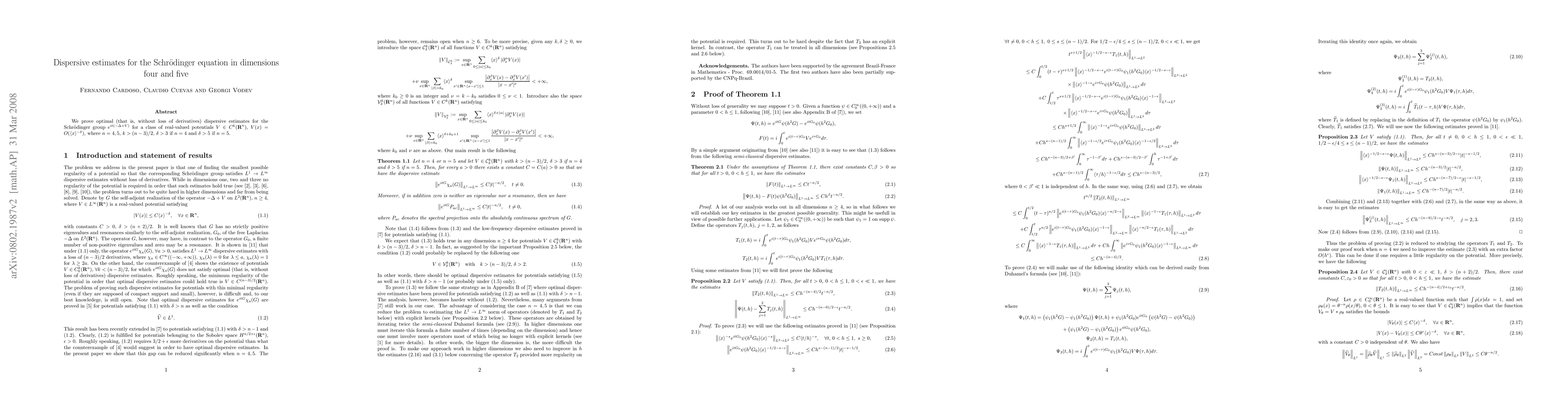 Summary: This paper establishes optimal dispersive estimates for the Schrödinger group in four and five dimensions for potentials with sufficient smoothness, ensuring no loss of derivatives. The estimates apply to a class of real-valued potentials defined by $V\in C^k(R^n)$ with $k>(n-3)/2$.