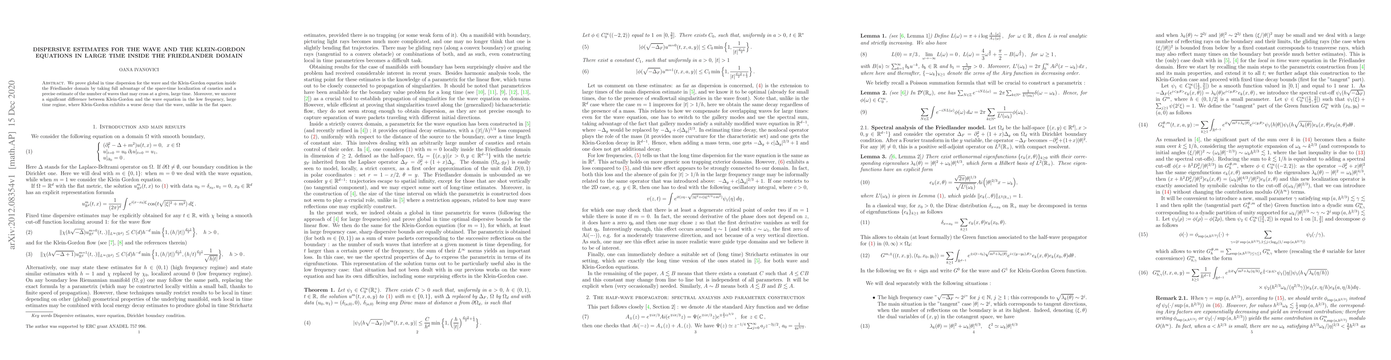 We prove global in time dispersion for the wave and the Klein-Gordon equation inside the Friedlander domain by taking full advantage of the space-time localization of caustics and a precise estimate of the number of waves that may cross at a given, large time. Moreover, we uncover a significant difference between Klein-Gordon and the wave equation in the low frequency, large time regime, where Klein-Gordon exhibits a worse decay that the wave, unlike in the flat space.