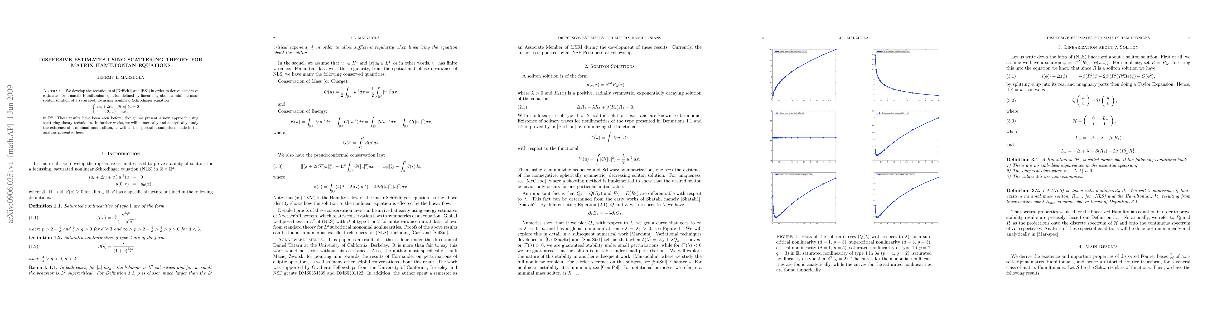 We develop the techniques of \cite{KS1} and \cite{ES1} in order to derive dispersive estimates for a matrix Hamiltonian equation defined by linearizing about a minimal mass soliton solution of a saturated, focussing nonlinear Schr\"odinger equation {c} i u_t + \Delta u + \beta (|u|^2) u = 0 u(0,x) = u_0 (x), in $\reals^3$. These results have been seen before, though we present a new approach using scattering theory techniques. In further works, we will numerically and analytically study the existence of a minimal mass soliton, as well as the spectral assumptions made in the analysis presented here.