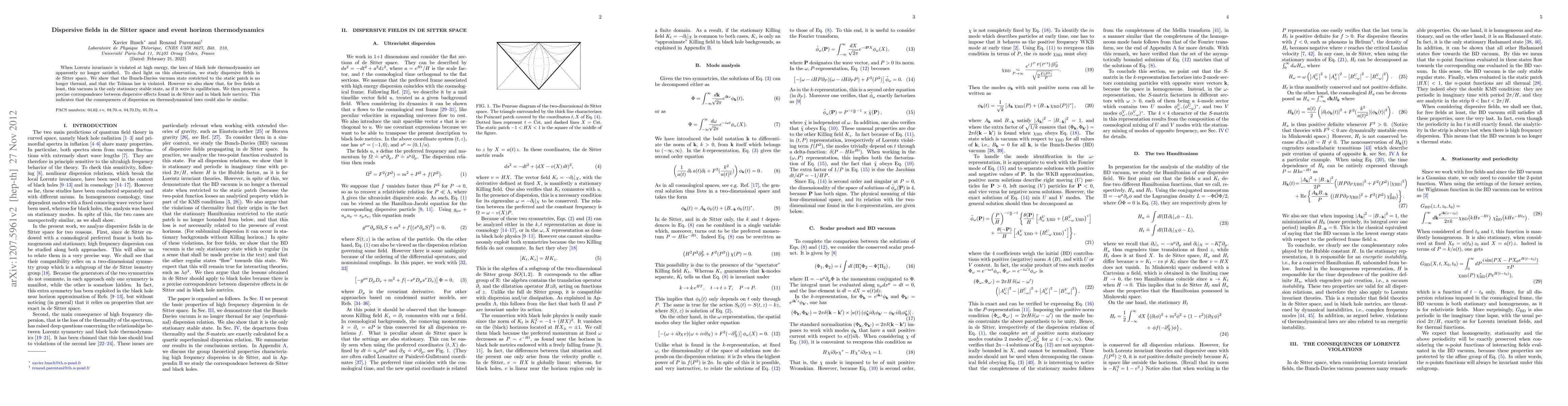 When Lorentz invariance is violated at high energy, the laws of black hole thermodynamics are apparently no longer satisfied. To shed light on this observation, we study dispersive fields in de Sitter space. We show that the Bunch-Davies vacuum state restricted to the static patch is no longer thermal, and that the Tolman law is violated. However we also show that, for free fields at least, this vacuum is the only stationary stable state, as if it were in equilibrium. We then present a precise correspondence between dispersive effects found in de Sitter and in black hole metrics. This indicates that the consequences of dispersion on thermodynamical laws could also be similar.