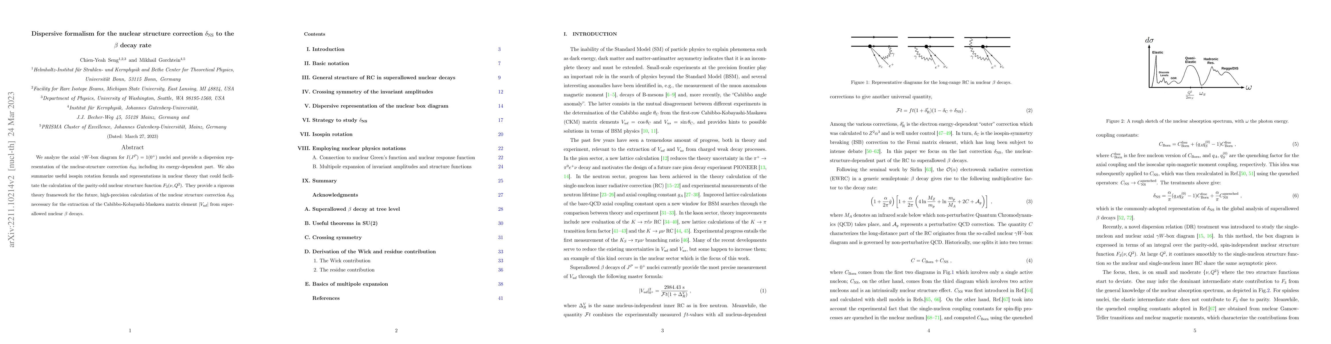 This paper develops a dispersive formalism to accurately calculate the nuclear structure correction $\delta_\text{NS}$ affecting $\beta$ decay rates, providing a rigorous theoretical framework for future high-precision calculations necessary for determining the $|V_{ud}|$ matrix element from superallowed nuclear $\beta$ decays. It also includes useful isospin rotation formulas and representations for calculating the parity-odd nuclear structure function $F_3(\nu,Q^2)$.