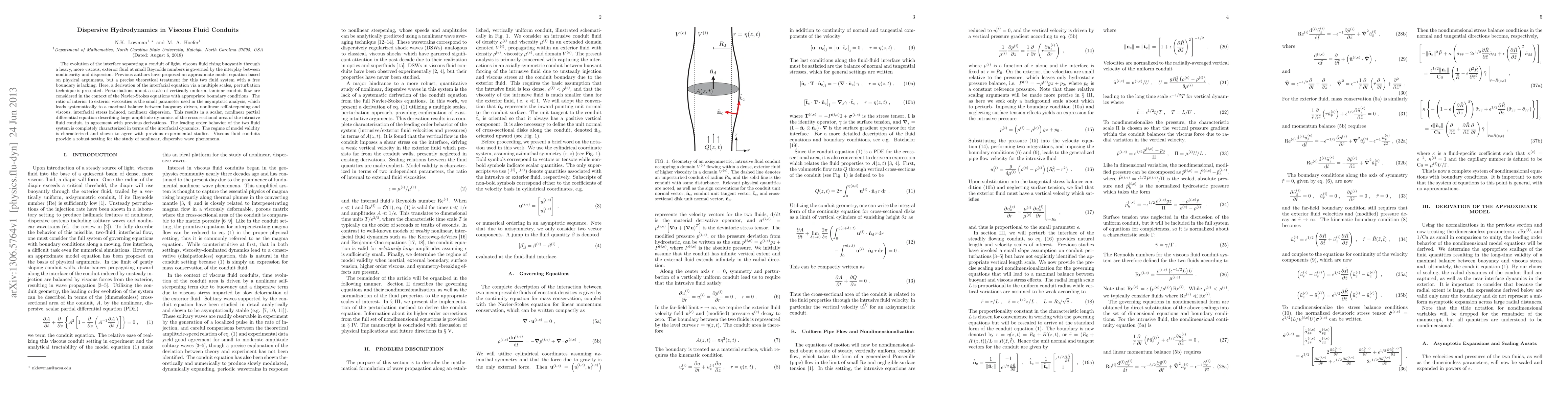 The evolution of the interface separating a conduit of light, viscous fluid rising buoyantly through a heavy, more viscous, exterior fluid at small Reynolds numbers is governed by the interplay between nonlinearity and dispersion. Previous authors have proposed an approximate model equation based on physical arguments, but a precise theoretical treatment for this two fluid system with a free boundary is lacking. Here, a derivation of the interfacial equation via a multiple scales, perturbation technique is presented. Perturbations about a state of vertically uniform, laminar conduit flow are considered in the context of the Navier-Stokes equations with appropriate boundary conditions. The ratio of interior to exterior viscosities is the small parameter used in the asymptotic analysis, which leads systematically to a maximal balance between buoyancy driven, nonlinear self-steepening and viscous, interfacial stress induced, nonlinear dispersion. This results in a scalar, nonlinear partial differential equation describing large amplitude dynamics of the cross-sectional area of the intrusive fluid conduit, in agreement with previous derivations. The leading order behavior of the two fluid system is completely characterized in terms of the interfacial dynamics. The regime of model validity is characterized and shown to agree with previous experimental studies. Viscous fluid conduits provide a robust setting for the study of nonlinear, dispersive wave phenomena.