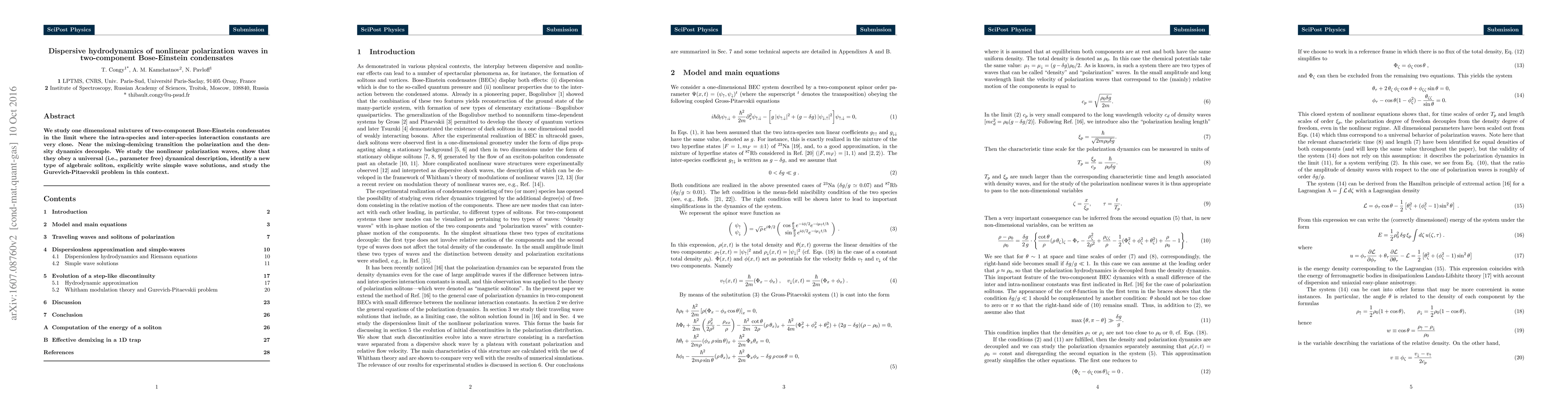 This paper investigates the dispersive hydrodynamics of nonlinear polarization waves in one-dimensional mixtures of two-component Bose-Einstein condensates, revealing a universal dynamical description for these waves and identifying a novel type of algebraic soliton near the mixing-demixing transition.