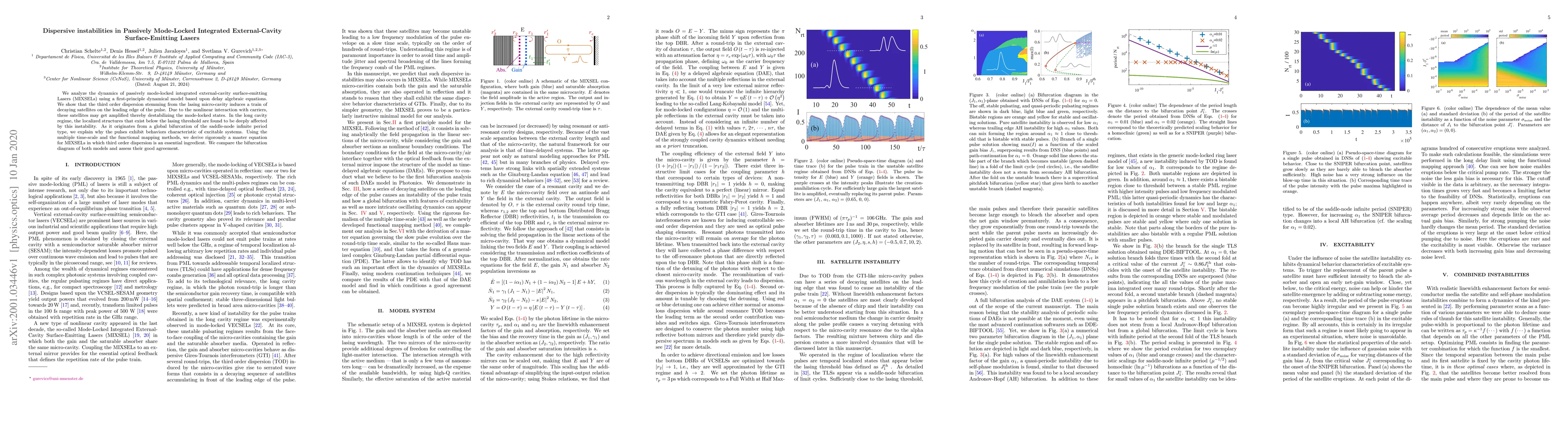 We analyze the dynamics of passively mode-locked integrated external-cavity surface-emitting Lasers (MIXSELs) using a first-principle dynamical model based upon delay algebraic equations. We show that the third order dispersion stemming from the lasing micro-cavity induces a train of decaying satellites on the leading edge of the pulse. Due to the nonlinear interaction with carriers, these satellites may get amplified thereby destabilizing the mode-locked states. In the long cavity regime, the localized structures that exist below the lasing threshold are found to be deeply affected by this instability. As it originates from a global bifurcation of the saddle-node infinite period type, we explain why the pulses exhibit behaviors characteristic of excitable systems. Using the multiple time-scale and the functional mapping methods, we derive rigorously a master equation for MIXSELs in which third order dispersion is an essential ingredient. We compare the bifurcation diagram of both models and assess their good agreement.