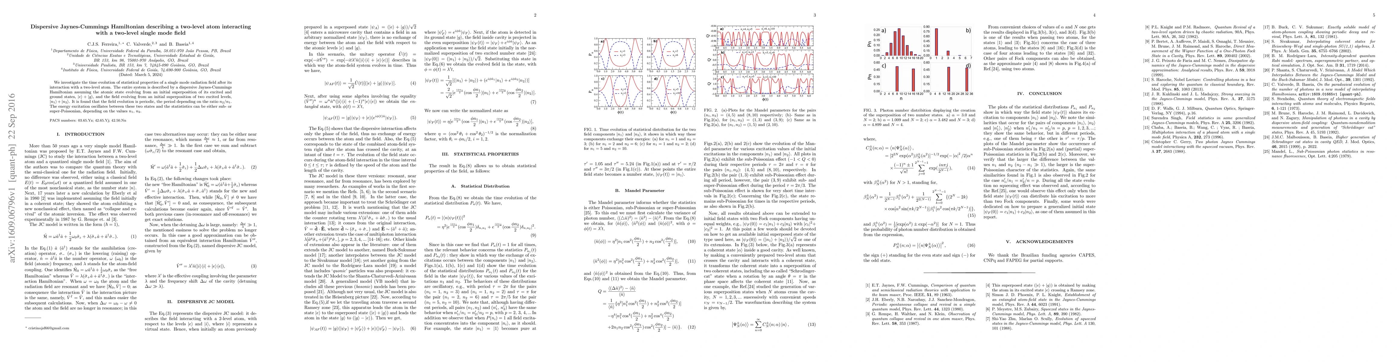 This paper studies the time evolution of a two-level atom interacting with a single mode field using a dispersive Jaynes-Cummings Hamiltonian. The field's statistical properties exhibit periodic evolution, with the period dependent on the ratio of initial photon states, leading to either sub- or super-Poissonian statistics.