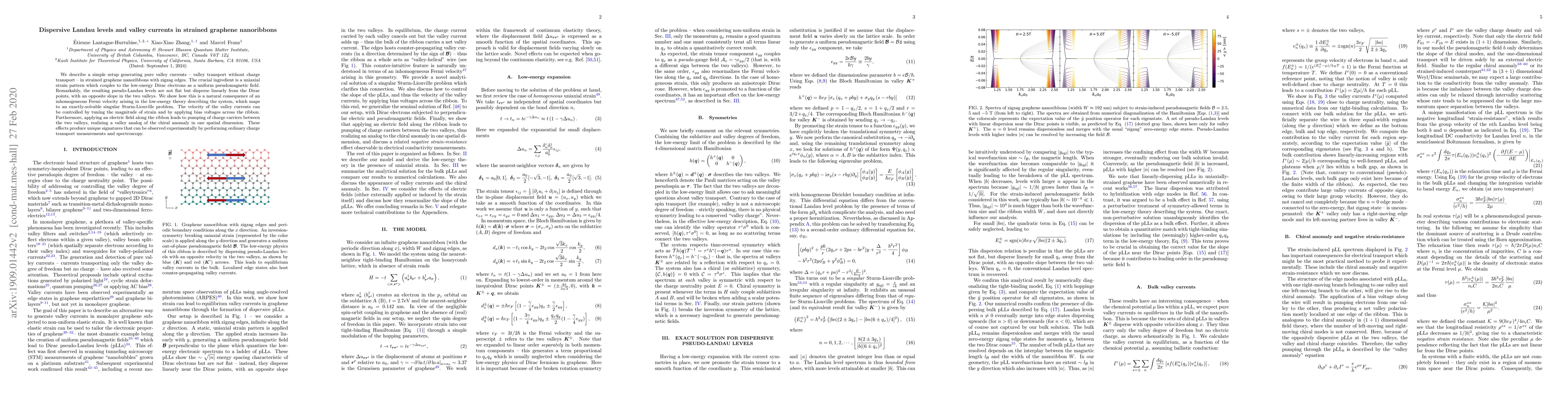 We describe a simple setup generating pure valley currents -- valley transport without charge transport -- in strained graphene nanoribbons with zigzag edges. The crucial ingredient is a uniaxial strain pattern which couples to the low-energy Dirac electrons as a uniform pseudomagnetic field. Remarkably, the resulting pseudo-Landau levels are not flat but disperse linearly from the Dirac points, with an opposite slope in the two valleys. We show how this is a natural consequence of an inhomogeneous Fermi velocity arising in the low-energy theory describing the system, which maps to an exactly-solvable singular Sturm-Liouville problem. The velocity of the valley currents can be controlled by tuning the magnitude of strain and by applying bias voltages across the ribbon. Furthermore, applying an electric field along the ribbon leads to pumping of charge carriers between the two valleys, realizing a valley analog of the chiral anomaly in one spatial dimension. These effects produce unique signatures that can be observed experimentally by performing ordinary charge transport measurements and spectroscopy.