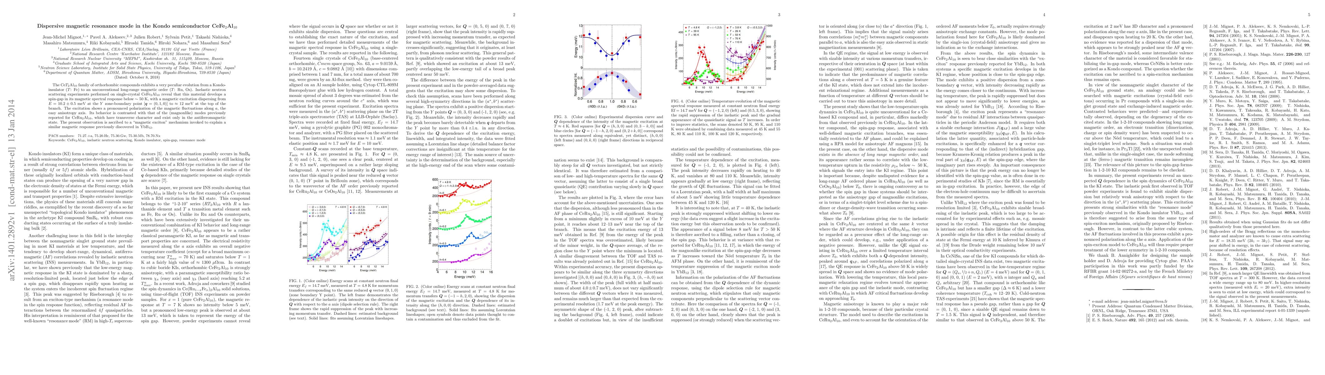 In CeFe2Al10, inelastic neutron scattering reveals a spin-gap and dispersive magnetic excitations forming a magnetic resonance mode, contrasting with the transverse modes in CeRu2Al10, suggesting a "magnetic exciton" mechanism.