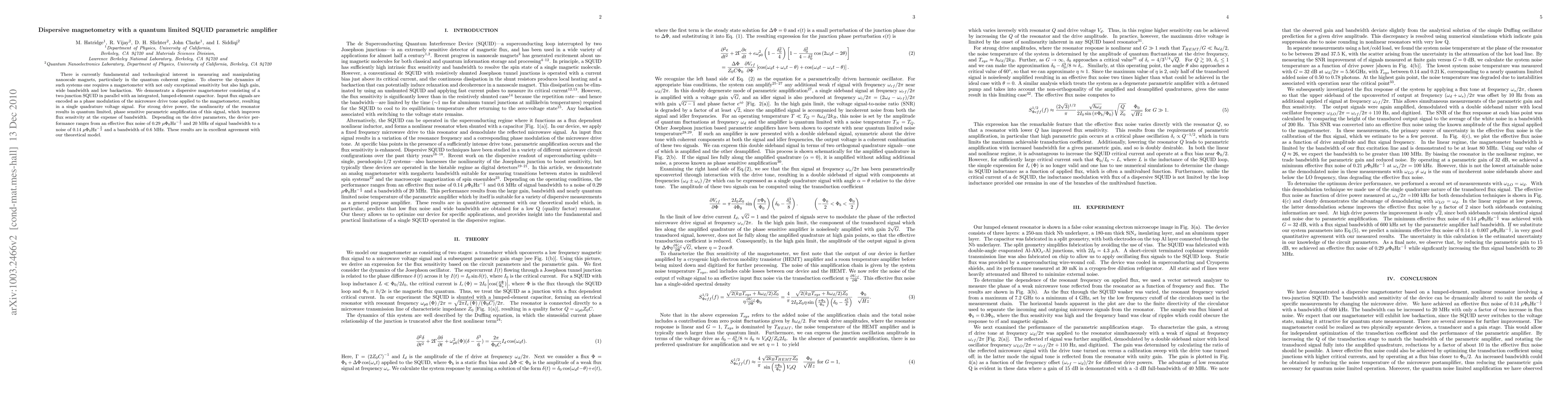 This paper presents a dispersive magnetometer using a quantum limited SQUID parametric amplifier, achieving high sensitivity and gain for nanoscale magnet measurements. The device demonstrates quantum limited amplification with flux noise as low as 0.14 $\mu\Phi_{0}$Hz$^{-\frac{1}{2}}$, though at the cost of reduced bandwidth.