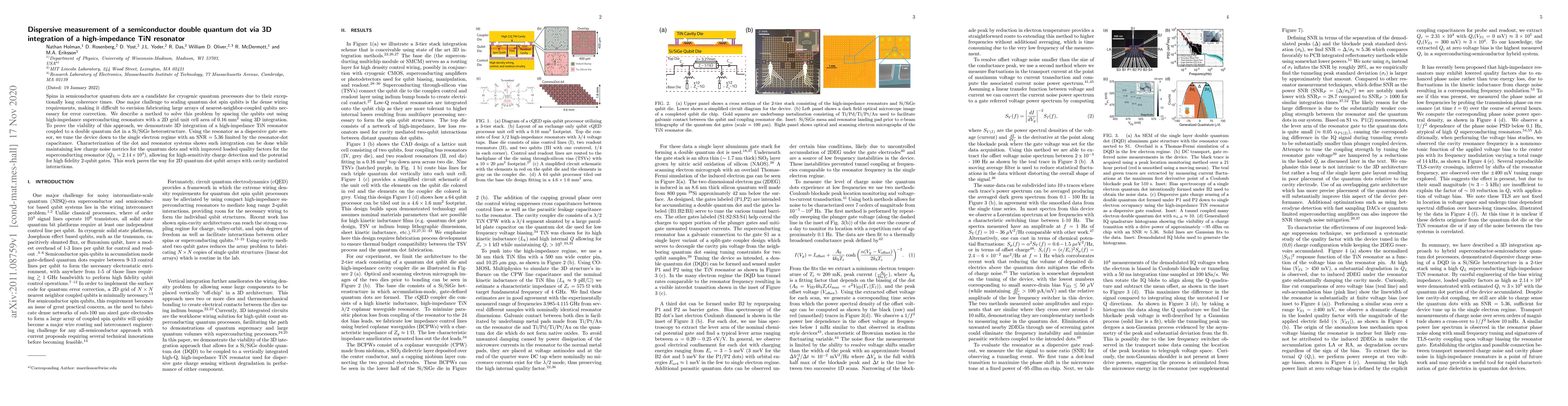 This paper presents a method for integrating high-impedance TiN resonators with semiconductor double quantum dots via 3D integration, enabling dispersive measurement and scalable quantum dot spin qubits. The demonstrated setup maintains low charge noise and high resonator quality factors, facilitating high-sensitivity charge detection and potential high-fidelity 2-qubit gates.