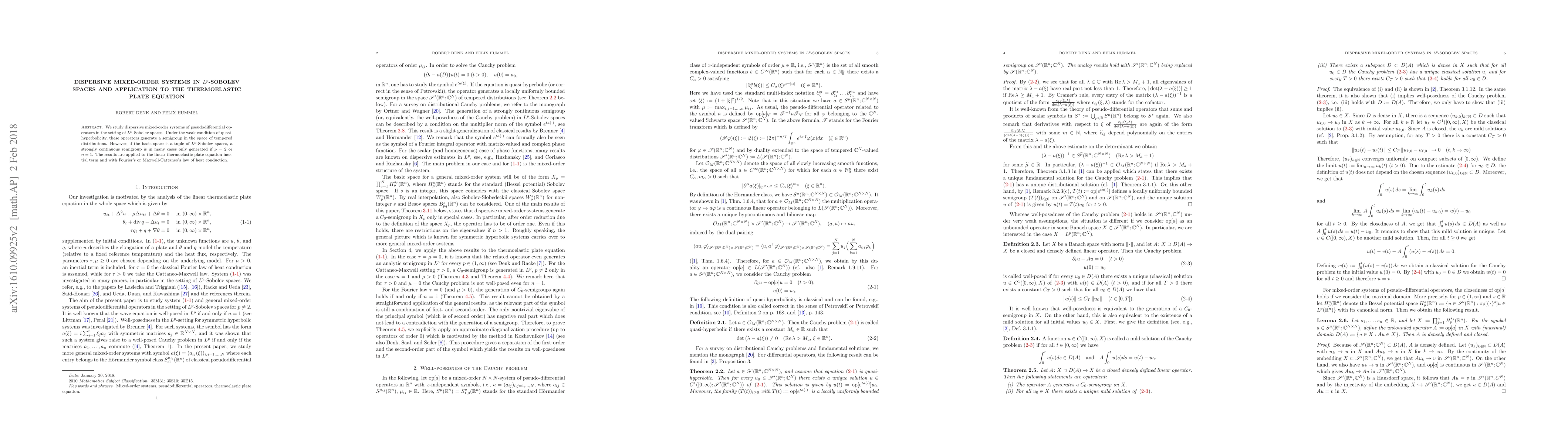 We study dispersive mixed-order systems of pseudodifferential operators in the setting of $L^p$-Sobolev spaces. Under the weak condition of quasi-hyperbolicity, these operators generate a semigroup in the space of tempered distributions. However, if the basic space is a tuple of $L^p$-Sobolev spaces, a strongly continuous semigroup is in many cases only generated if $p=2$ or $n=1$. The results are applied to the linear thermoelastic plate equation inertial term and with Fourier's or Maxwell-Cattaneo's law of heat conduction.