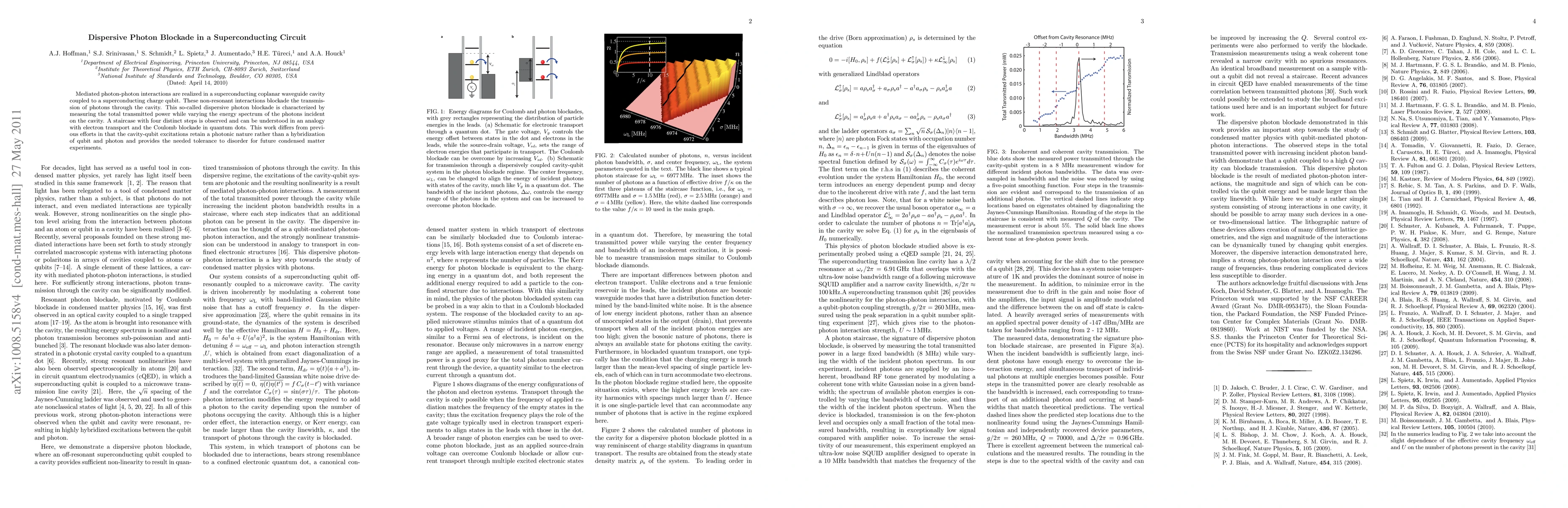 This paper demonstrates a dispersive photon blockade in a superconducting circuit, showing non-resonant photon-photon interactions via a coplanar waveguide cavity coupled to a charge qubit. The observed staircase pattern in transmitted power reflects Coulomb blockade-like behavior, distinguishing this effect from previous hybridized qubit-photon interactions.