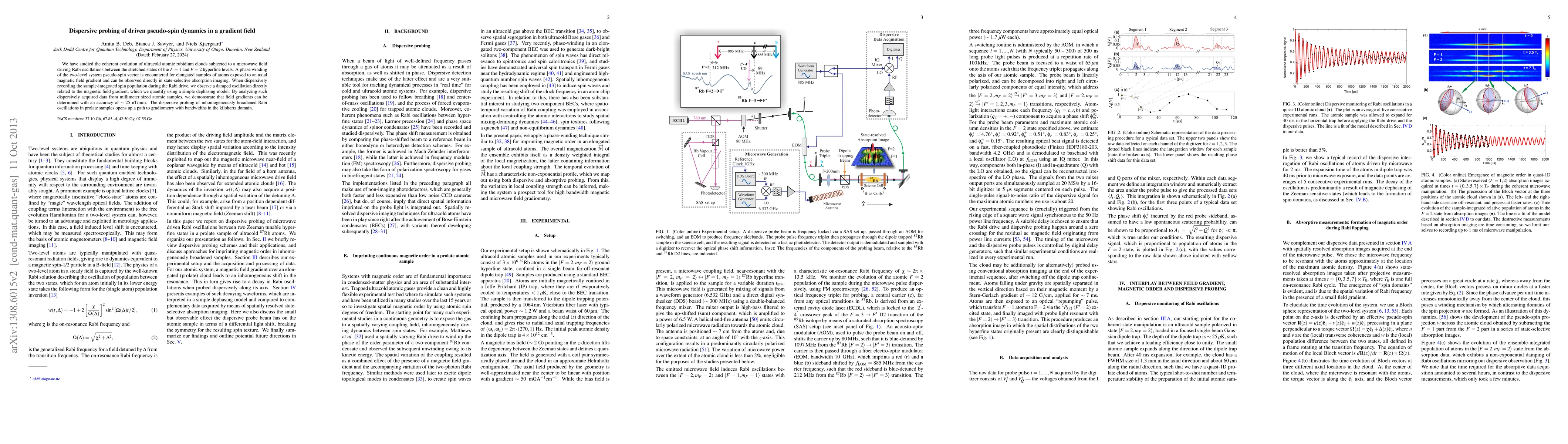 We have studied the coherent evolution of ultracold atomic rubidium clouds subjected to a microwave field driving Rabi oscillations between the stretched states of the F=1 and F=2 hyperfine levels. A phase winding of the two-level system pseudo-spin vector is encountered for elongated samples of atoms exposed to an axial magnetic field gradient and can be observed directly in state-selective absorption imaging. When dispersively recording the sample-integrated spin population during the Rabi drive, we observe a damped oscillation directly related to the magnetic field gradient, which we quantify using a simple dephasing model. By analyzing such dispersively acquired data from millimeter sized atomic samples, we demonstrate that field gradients can be determined with an accuracy of $\sim25$ nT/mm. The dispersive probing of inhomogeneously broadened Rabi oscillations in prolate samples opens up a path to gradiometry with bandwidths in the kilohertz domain.