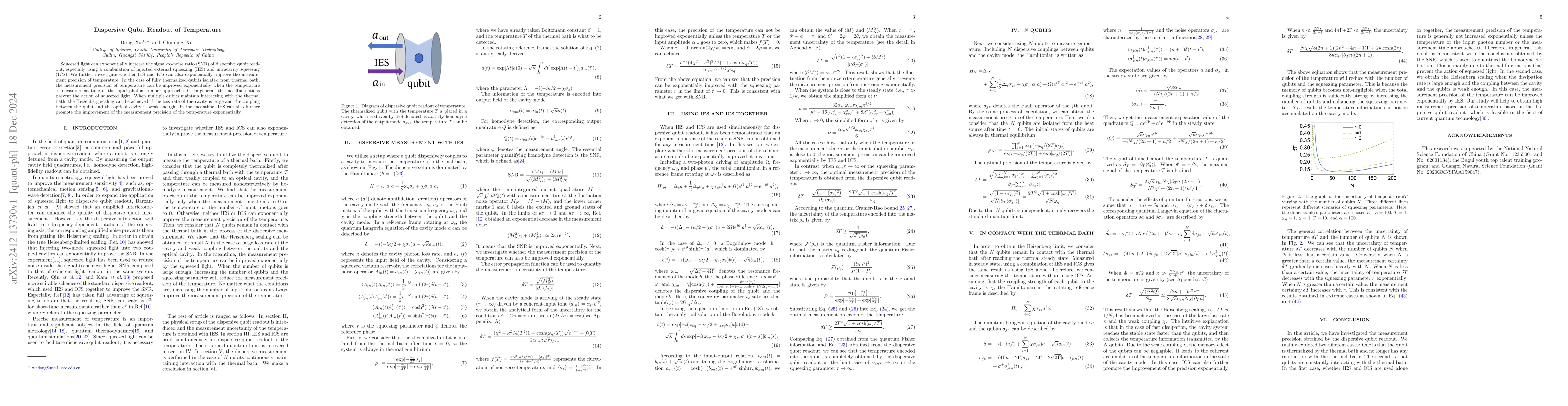 This research investigates how squeezed light enhances the signal-to-noise ratio in dispersive qubit readout, especially through injected external and intracavity squeezing. It concludes that while squeezed light can exponentially improve temperature measurement precision under certain conditions, thermal fluctuations generally limit this enhancement.