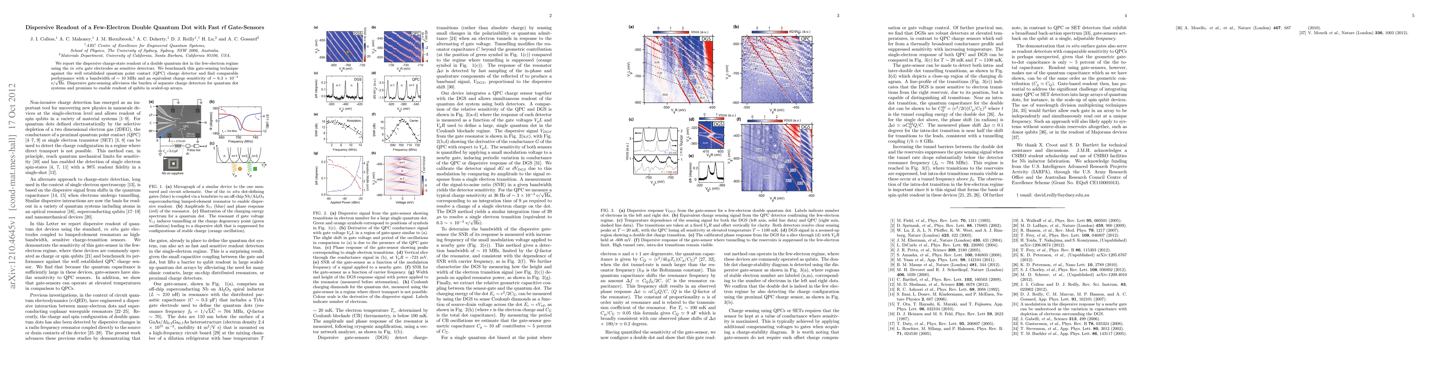 This paper presents a dispersive readout technique for a few-electron double quantum dot using fast rf gate-sensors, achieving comparable performance to quantum point contact detectors with a bandwidth of 10 MHz and a charge sensitivity of 6.3 x 10^-3 e/√Hz, potentially simplifying readout in large-scale quantum dot arrays.