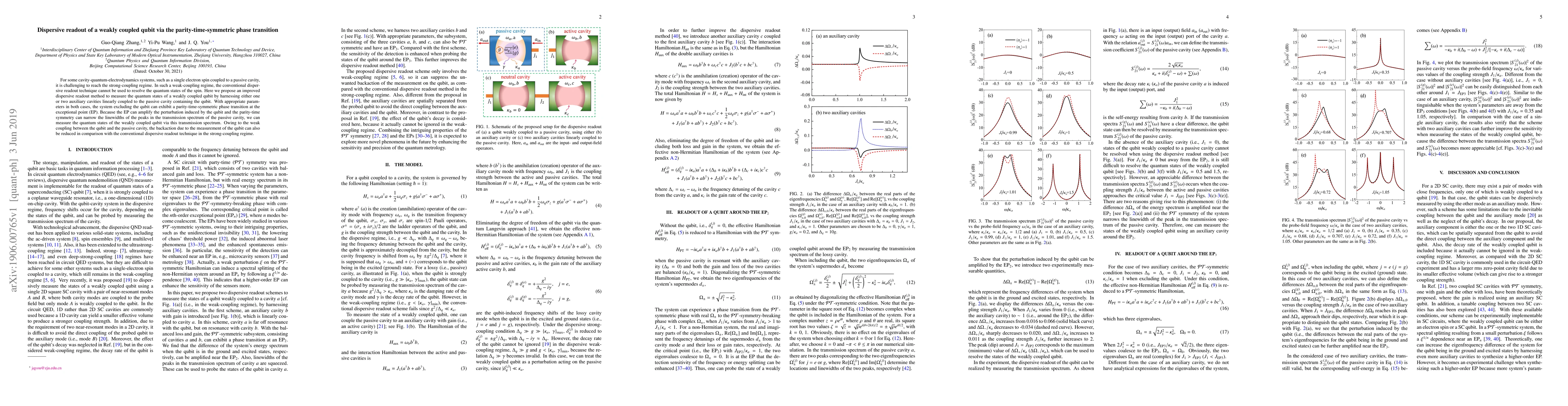This paper proposes an improved dispersive readout method for weakly coupled qubits using auxiliary cavities and a parity-time-symmetric phase transition at the exceptional point to amplify qubit perturbations and narrow spectral peaks, enabling measurement of qubit states with reduced backaction.